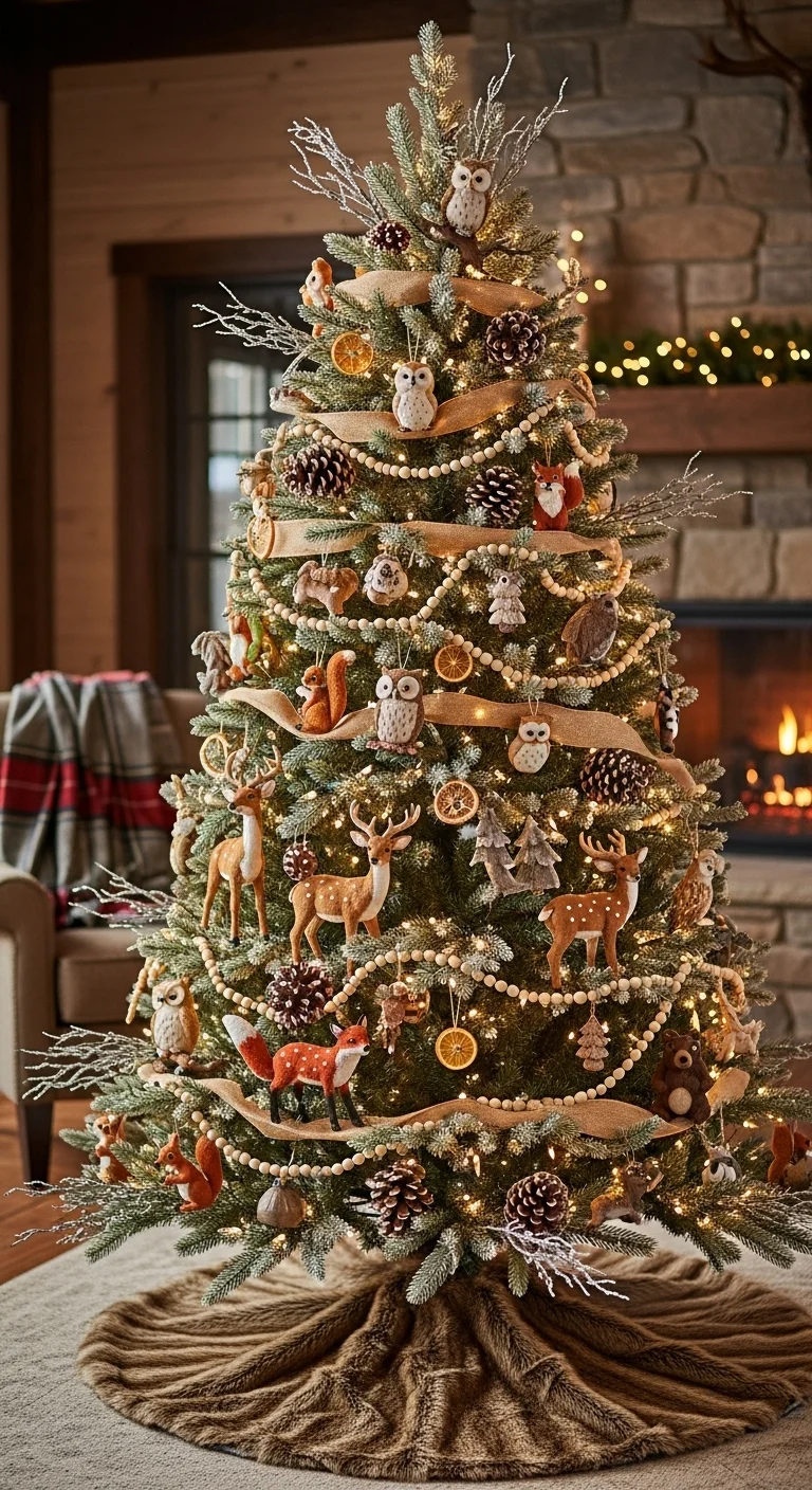 Think forest magic—owls, foxes, pinecones, and mossy greens. Add wooden ornaments and a plaid tree skirt. You can make mini animal ornaments from felt or clay. It brings the outdoors right into your living room.