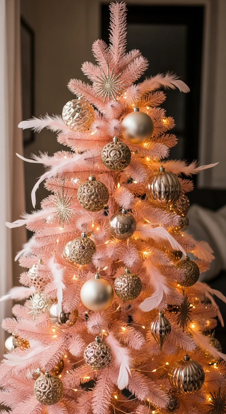 For a softer glam look, use blush pink with champagne gold. Add glittery accents and maybe a few feathers or pearls. It’s romantic and elegant but easy to recreate. You can even reuse old ornaments with blush spray paint.