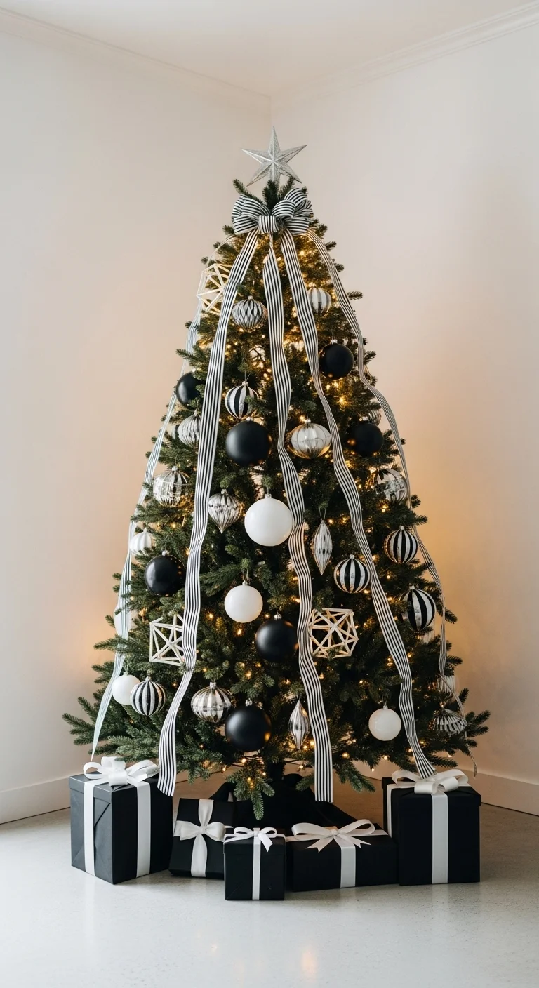 Try a bold black-and-white palette for a clean, graphic style. Mix matte black balls with shiny white ones. Add striped ribbon or black velvet bows. It’s unexpected but stylish and modern.