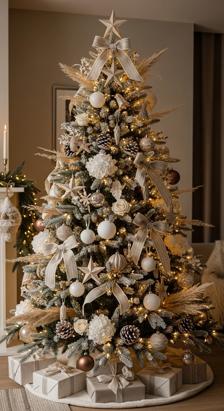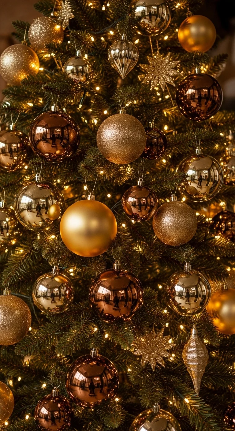 Mix metallics for a rich glow. Use ornaments in gold, bronze, and champagne shades. Add mirrored baubles and metallic ribbons for extra sparkle. It looks luxurious but can be done affordably with dollar-store finds and spray paint.