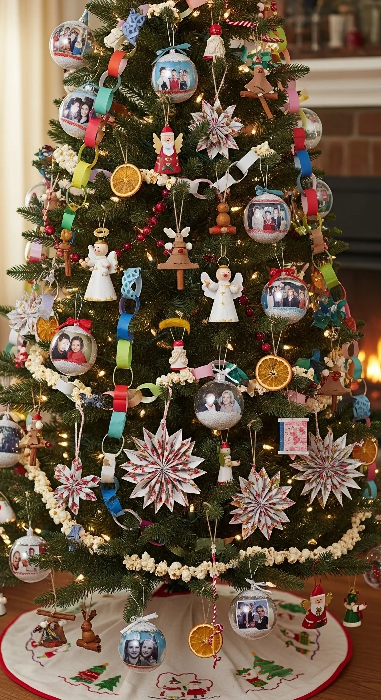 Hang photo ornaments, handwritten messages, and small mementos. Each ornament tells a story. You can make photo baubles with clear plastic ornaments and printed pictures. It’s sentimental and unique to your family.