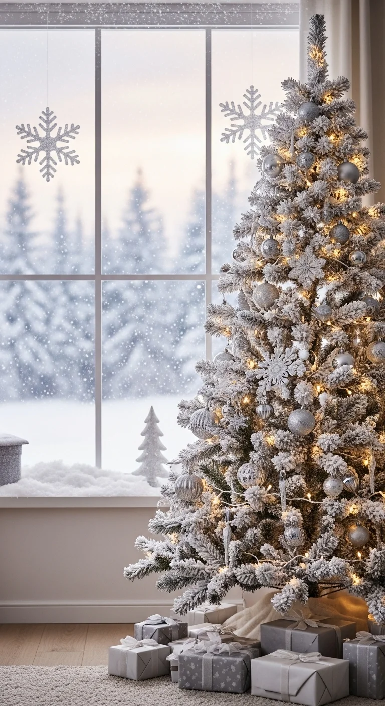 A flocked tree gives a snowy winter feel indoors. Keep the palette simple—white, silver, and glass. Add clear ornaments to reflect light and create a frosty shimmer. You can make your own faux snow by lightly spraying the branches with white paint or snow spray. It feels peaceful, clean, and bright.