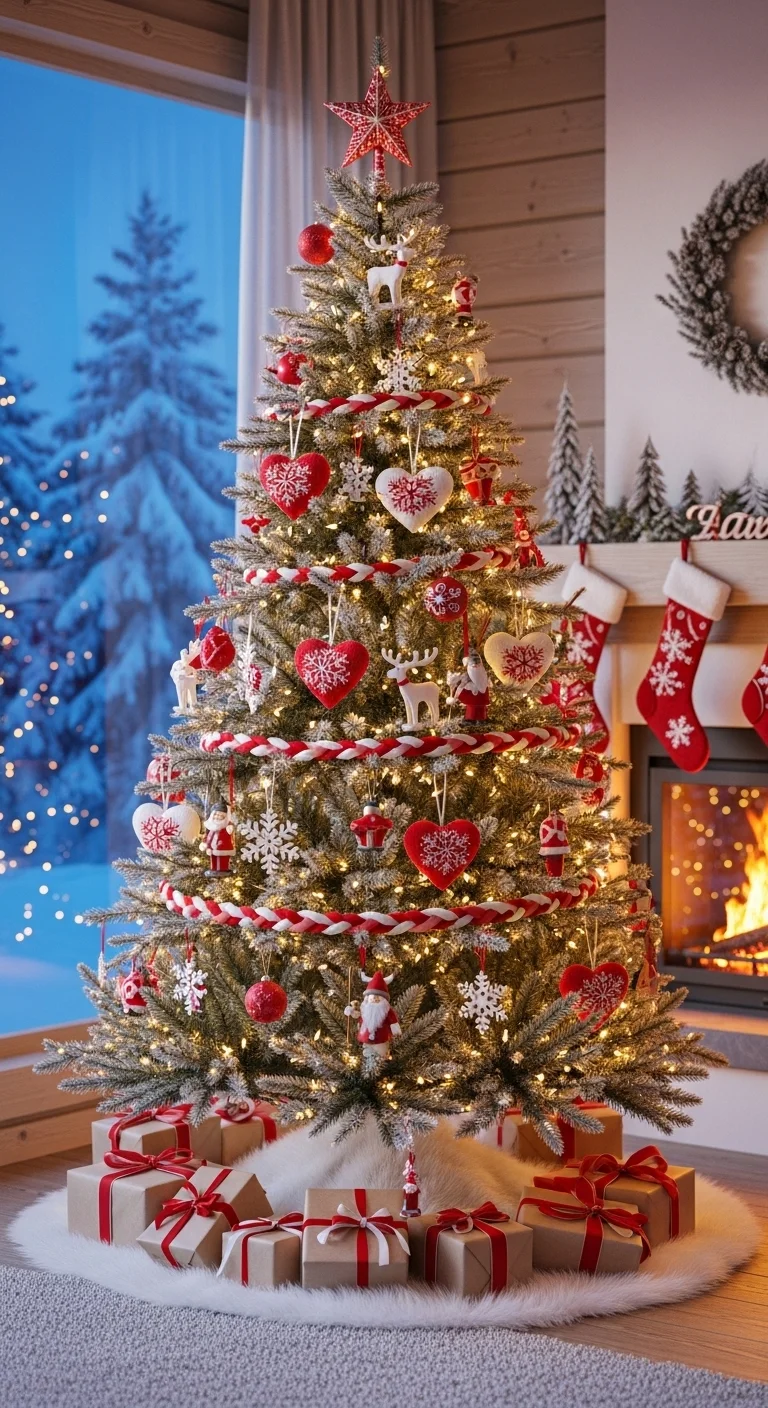 Keep it clean and cozy with a red and white Scandinavian look. Hang knitted hearts, stars, and wooden ornaments. Add paper snowflakes for a handmade feel. It’s festive but still simple.