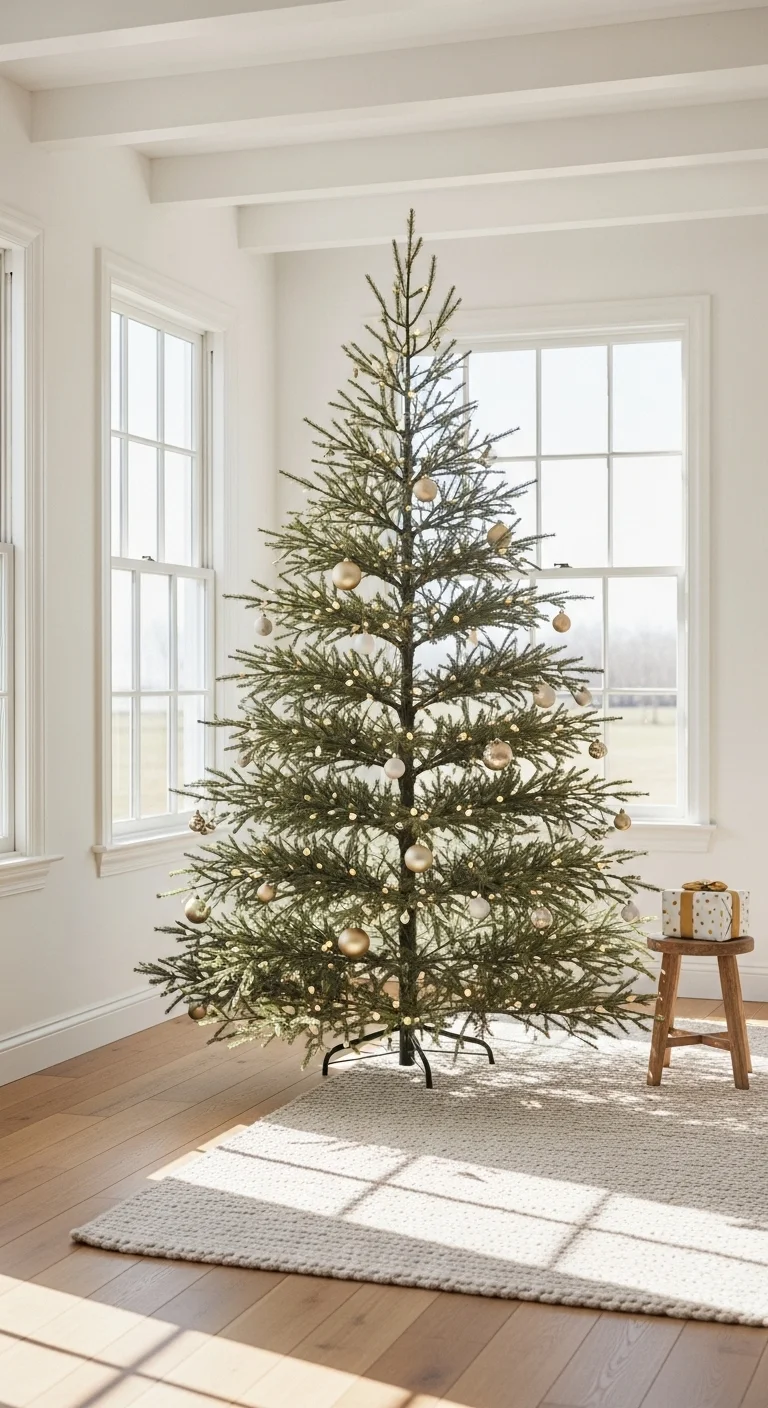 Skip heavy decor and keep it sleek. Use a few white or metallic ornaments spaced evenly. Add soft lights and let the shape of the tree shine. Perfect for lovers of clean, airy spaces.
