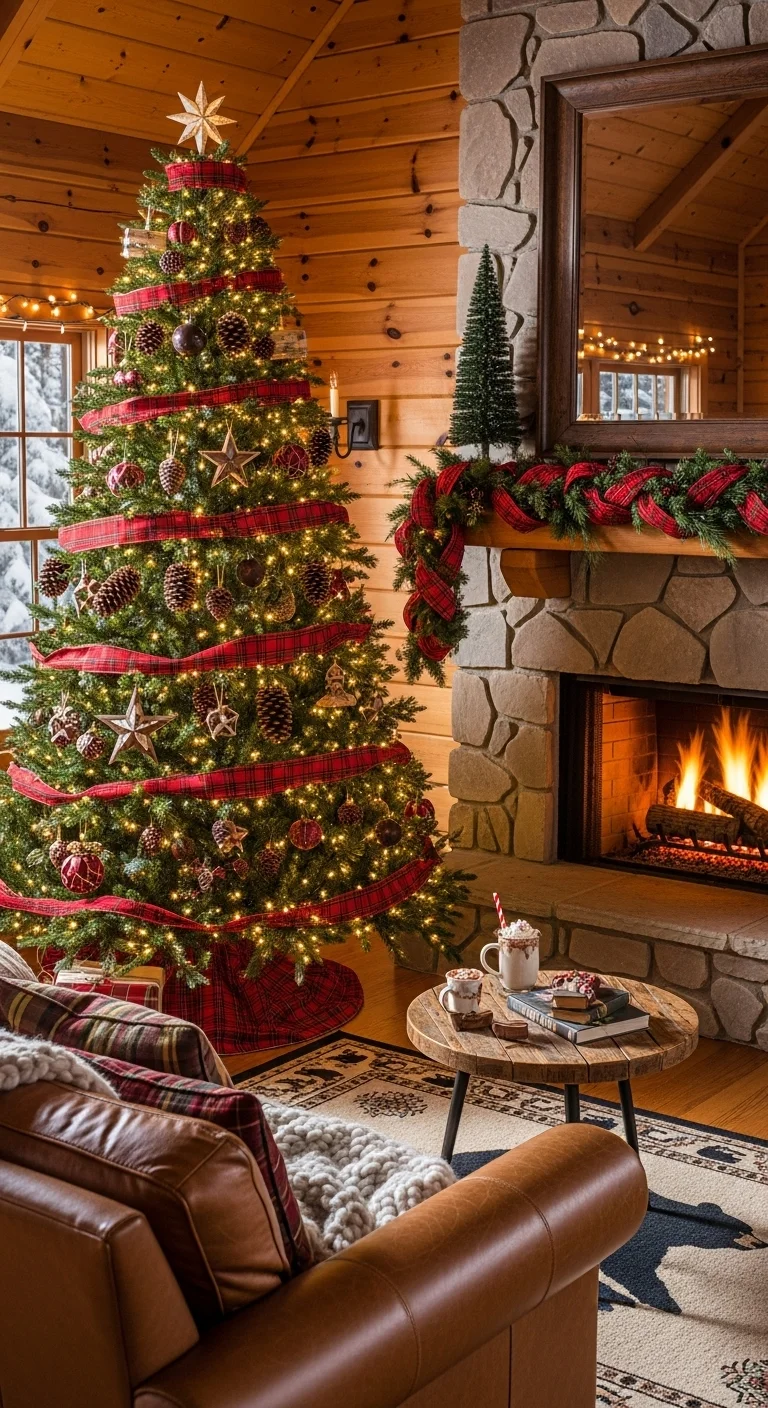 Plaid never goes out of style. Wrap plaid ribbon around the tree and mix in wooden stars or bells. Add pinecones for a rustic texture. It feels warm, welcoming, and easy to pull together.