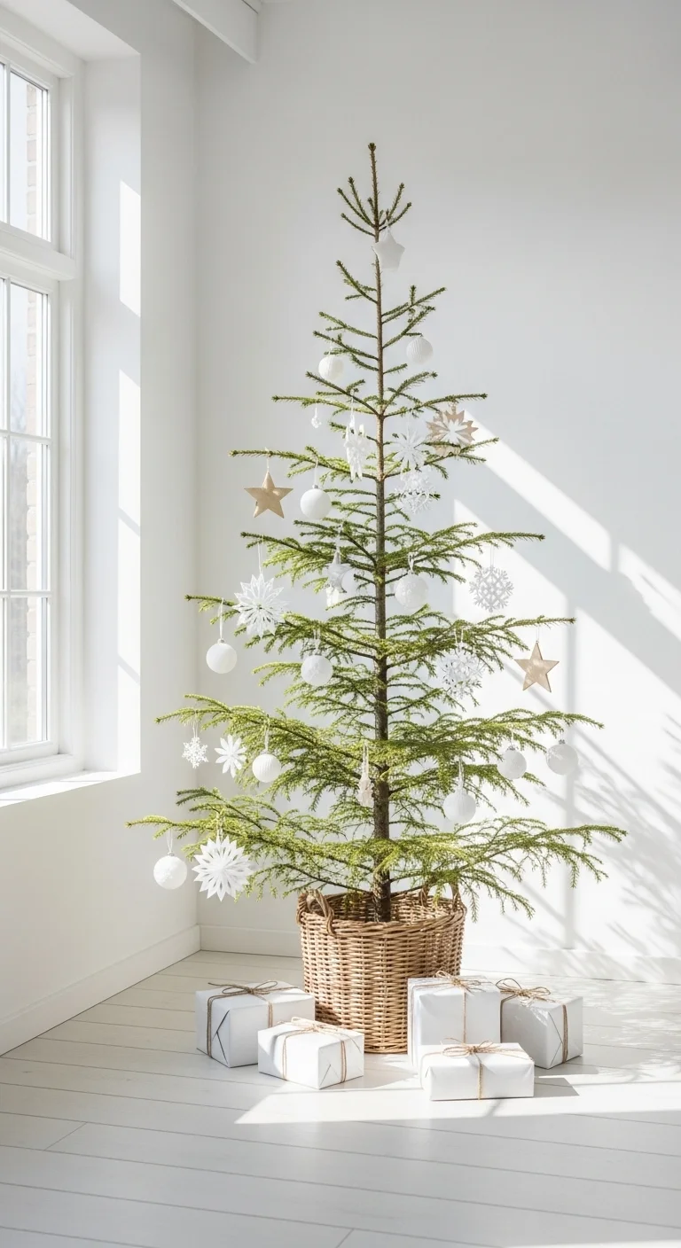 Keep it simple with a natural tree and clean decorations. White, beige, and wood tones work best. Skip heavy garlands and go for light ornaments or paper cutouts. This style feels calm and elegant, perfect for small spaces or modern homes.