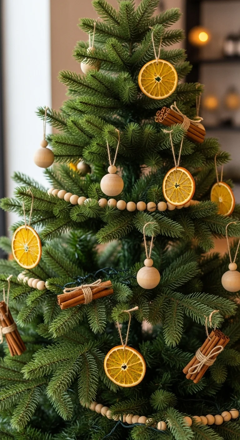 Decorate with organic materials—dried fruit, pinecones, cinnamon, and kraft paper ornaments. Wrap twine garland around for texture. The natural scent fills your home, and most items can be found right in your kitchen or backyard.