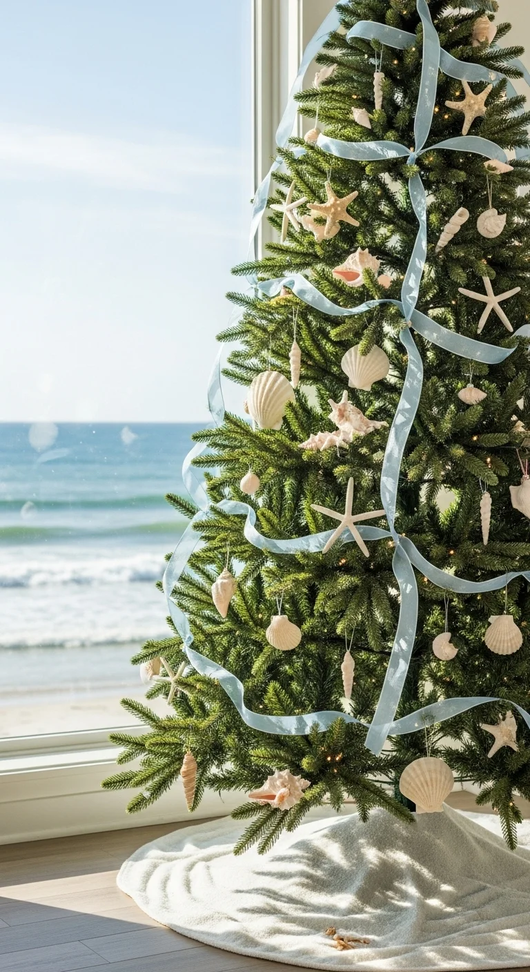 If you live near the coast or love the beach, go for a soft ocean theme. Use light blue, sand, and white tones. Decorate with shells, starfish, and raffia bows. It feels airy and fresh—like Christmas by the sea.