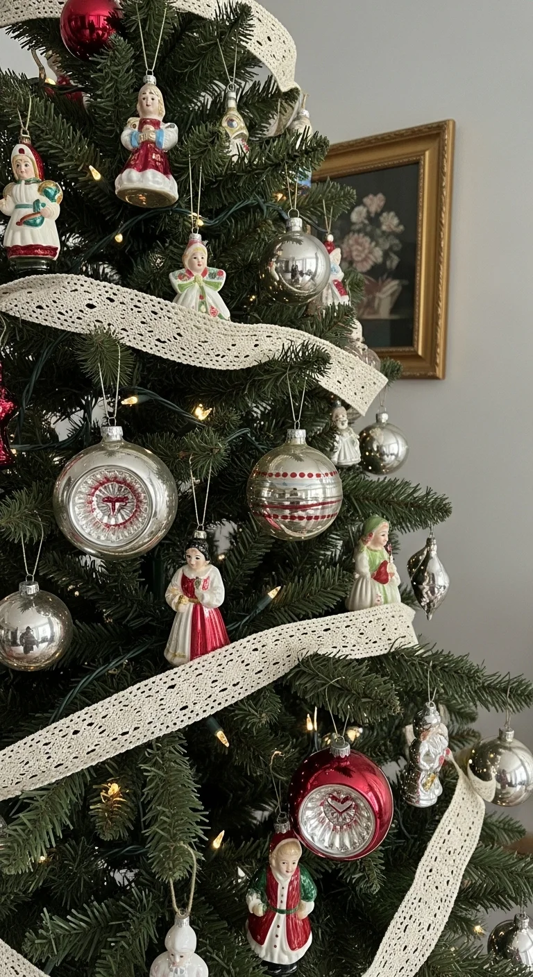 Bring back the charm of yesteryear with vintage-style ornaments. Use lace, old postcards, or small figurines. If you have handed-down decor, this is the perfect place to show it off. Add soft yellow lights to enhance the nostalgic mood.