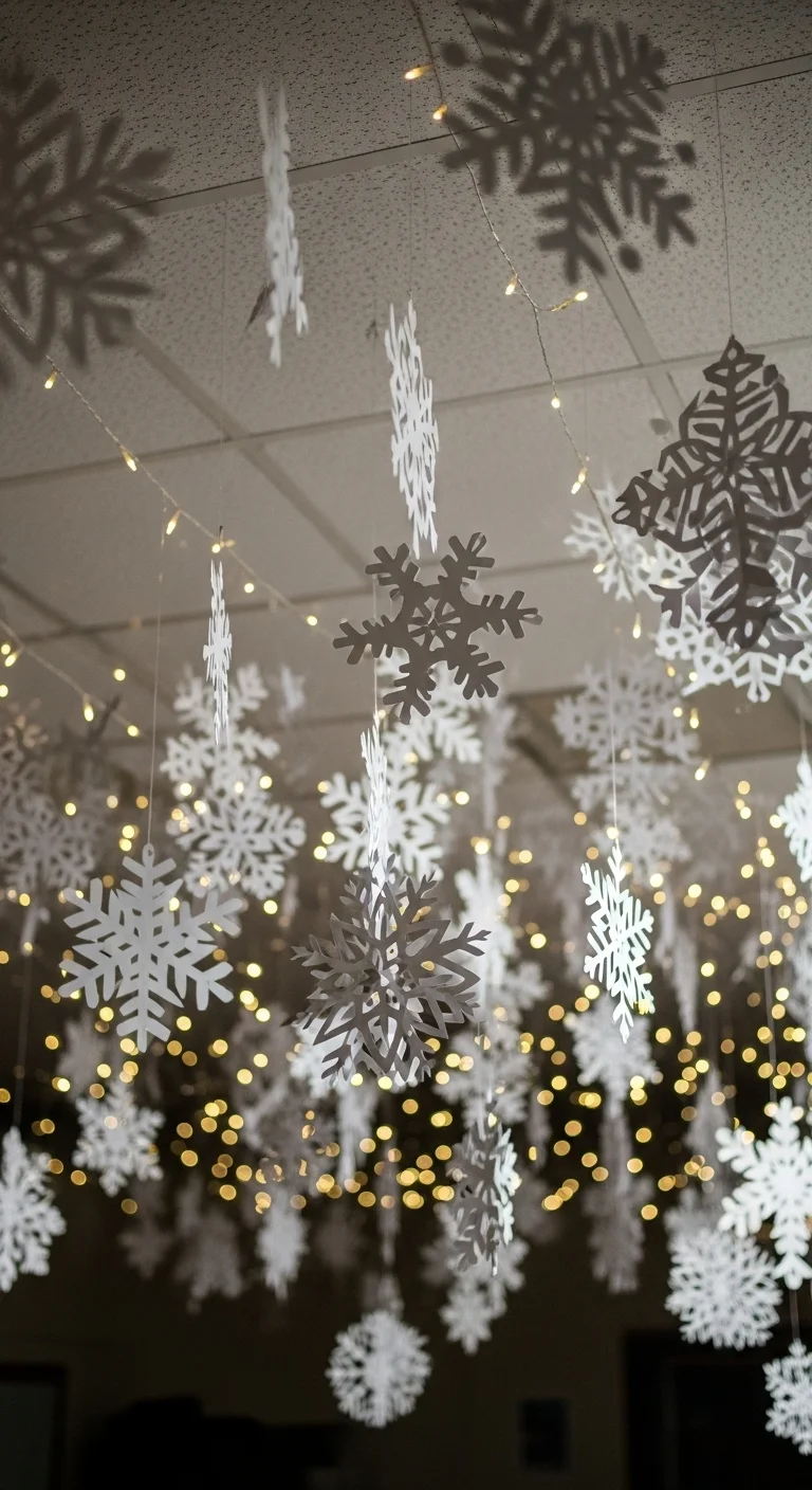 Turn your classroom into a snowy wonderland with handmade paper snowflakes. Hand each student a sheet of white paper and let them create their own designs. Hang the snowflakes from the ceiling using clear fishing line for a floating effect. Add string lights to make them sparkle. It’s simple, fun, and perfect for group activity time.