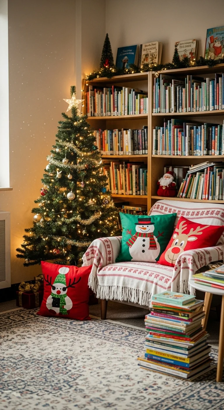 Make reading time festive by decorating a corner with fairy lights, cozy blankets, and holiday pillows. Display Christmas storybooks for the season. Add a small tree or plush toys to complete the look. It’s a warm space that encourages quiet time and imagination.