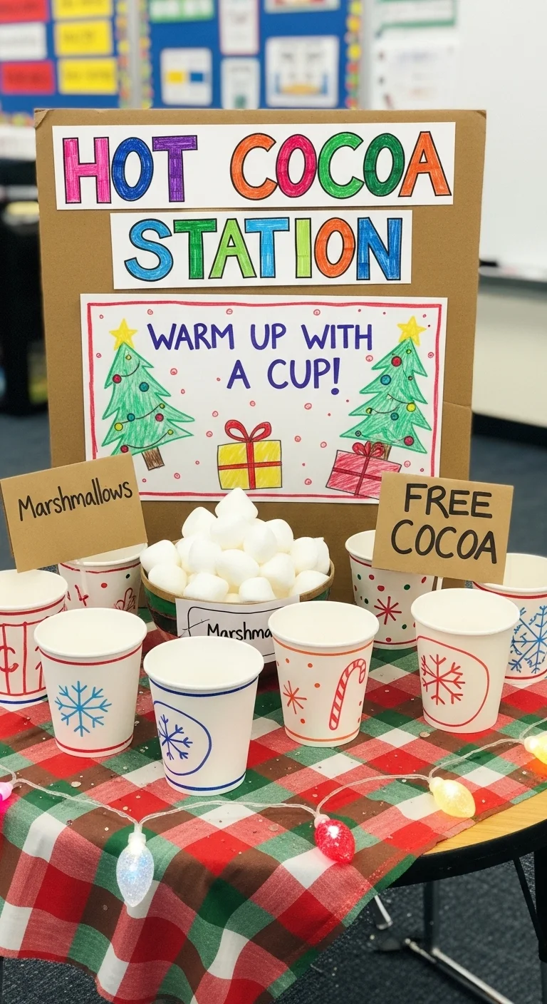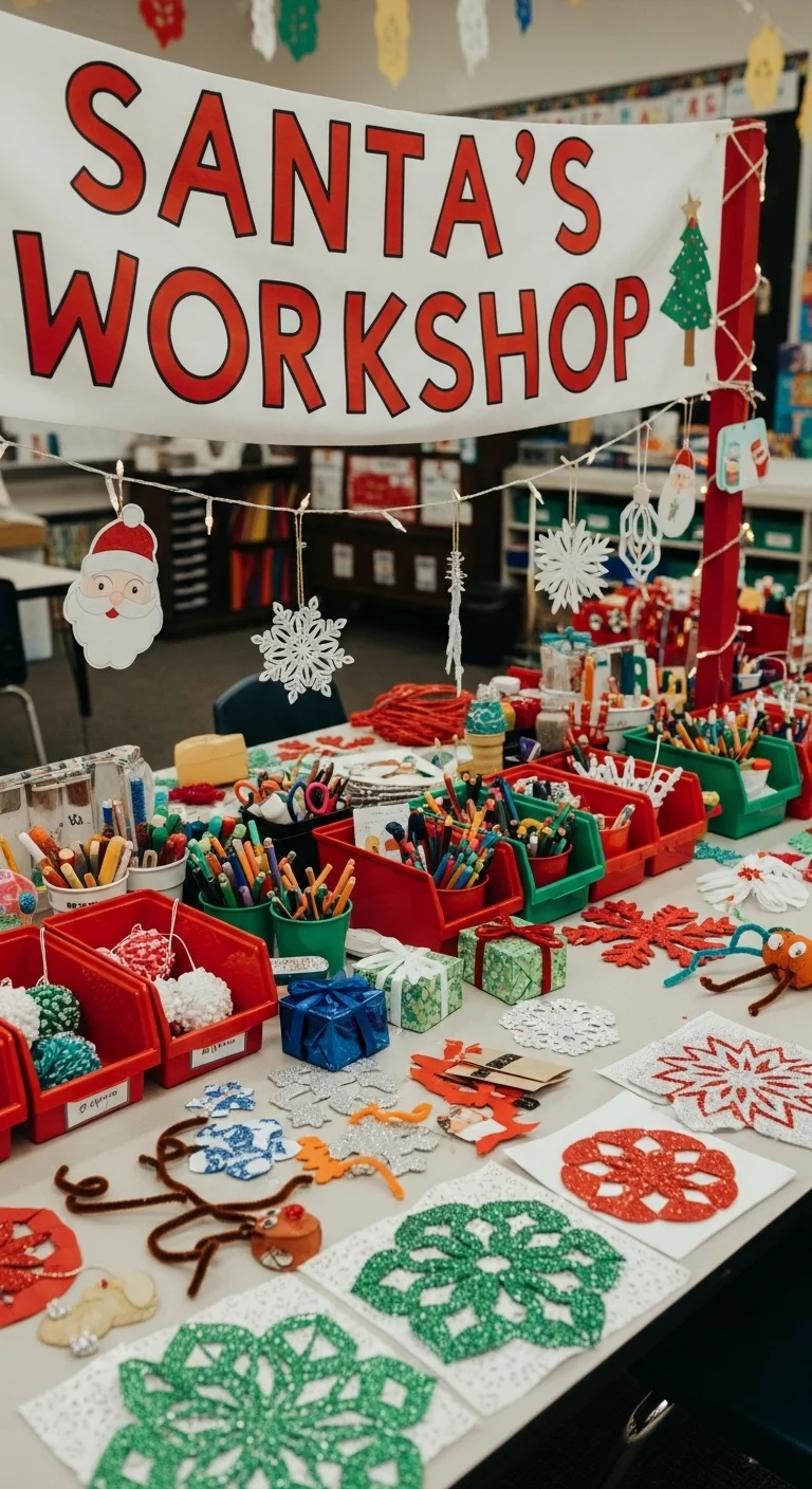 Set up a “Santa’s Workshop” table for craft time. Use red and green bins for supplies like paper, glue, and glitter. Add a sign made by the students. Let them rotate through and make cards or ornaments for family. It sparks creativity while decorating the room naturally.
