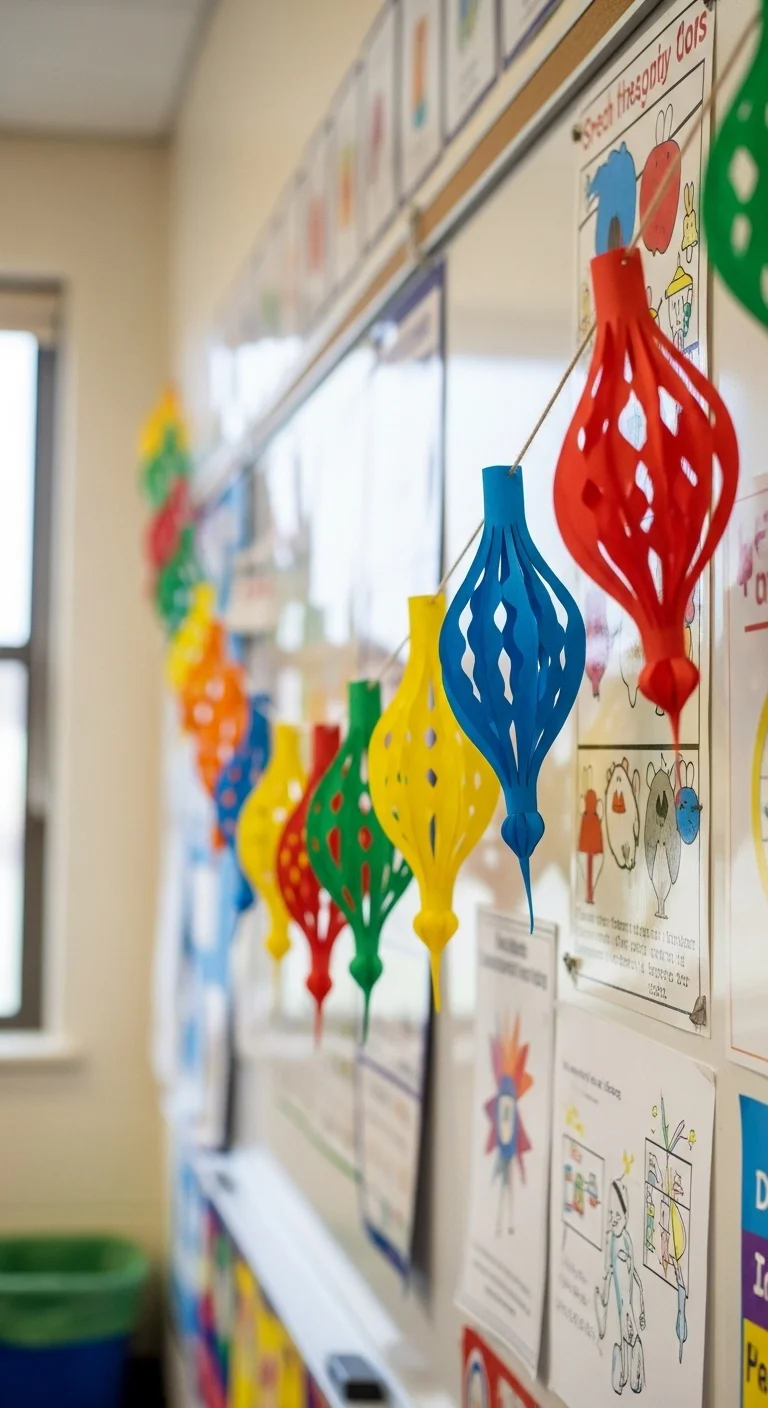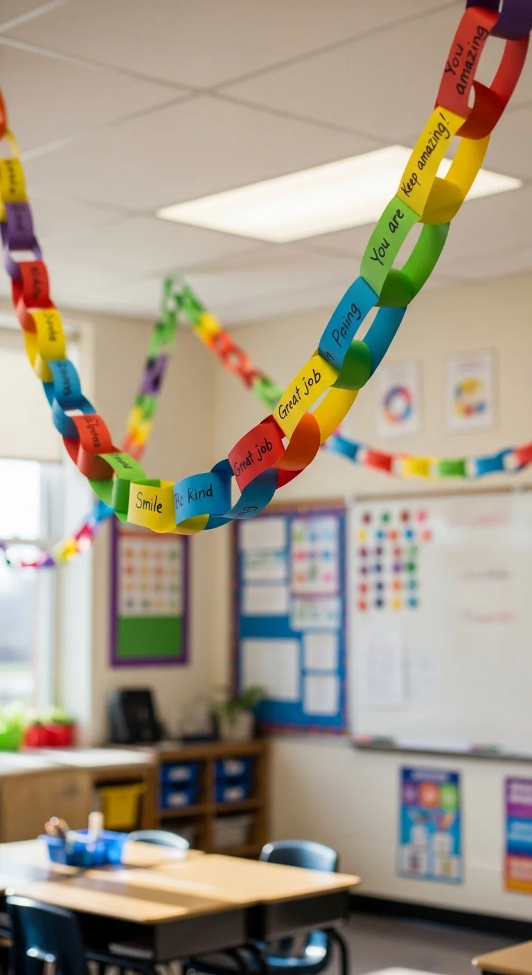 Cut out paper light bulb shapes in bright colors. Write positive words on each one — like joy, kindness, peace. String them together with yarn and hang across the classroom. It’s cheerful, colorful, and full of positive messages.