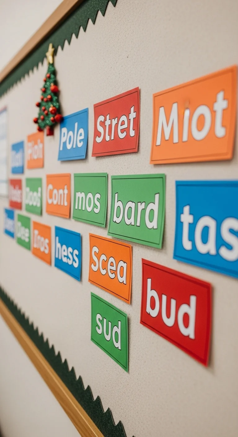 Create a Christmas word wall to mix decor with learning. Use festive cards for words like “Santa,” “snowflake,” and “sleigh.” Add illustrations or stickers. It keeps the classroom both decorative and educational through the season.