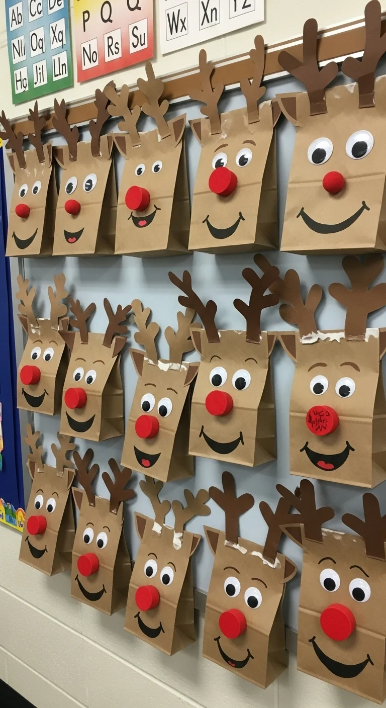 Host a reindeer craft day! Students can use paper bags, googly eyes, and red pompoms to make reindeer faces. Display them as a gallery across the wall. It’s easy, affordable, and looks great.