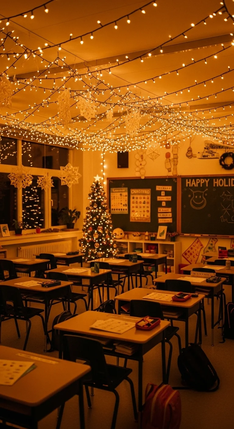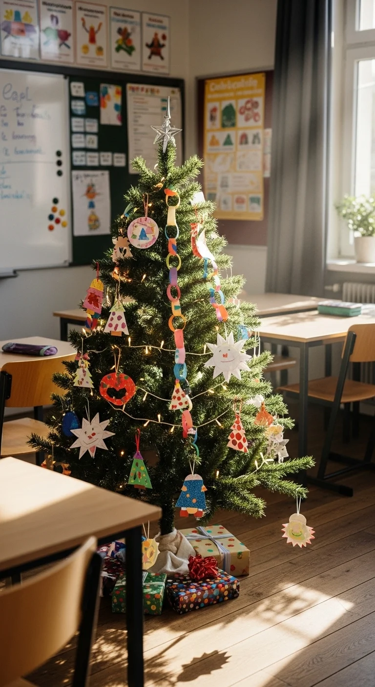 A small Christmas tree instantly makes the room feel cozy. Let students create their own ornaments using colored paper, popsicle sticks, or recycled materials. Have each child hang one on the tree for a personal touch. A string of fairy lights adds that classic glow.
