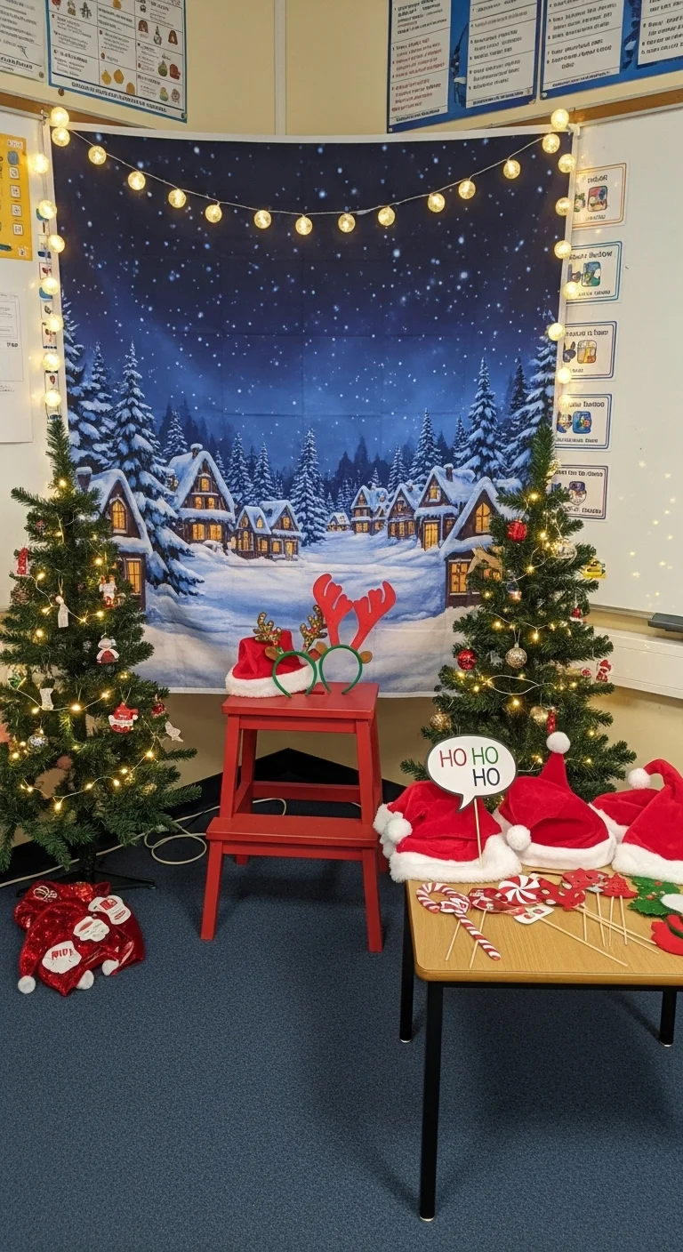 Set up a small photo corner for fun class pictures. Use wrapping paper as a backdrop, add a few props, and let students take turns posing. It’s a fun way to capture classroom memories.