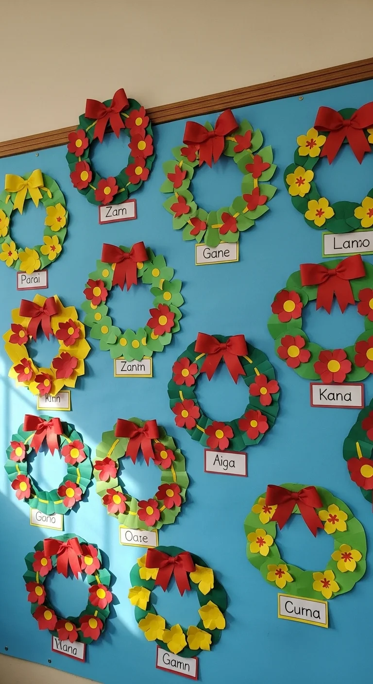 Have each student create a mini wreath from green paper circles. Decorate with red bows, stickers, or small photos. Hang them together on one wall to create a cheerful wreath display for the class.