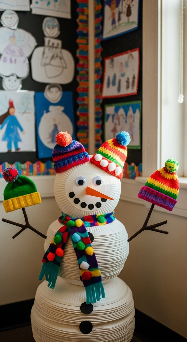 Stack three paper plates vertically to form a snowman and tape them to a wall or door. Add paper buttons, scarves, and hats. Students can personalize with funny faces or accessories. It’s a fun decoration and an easy group craft that costs almost nothing.