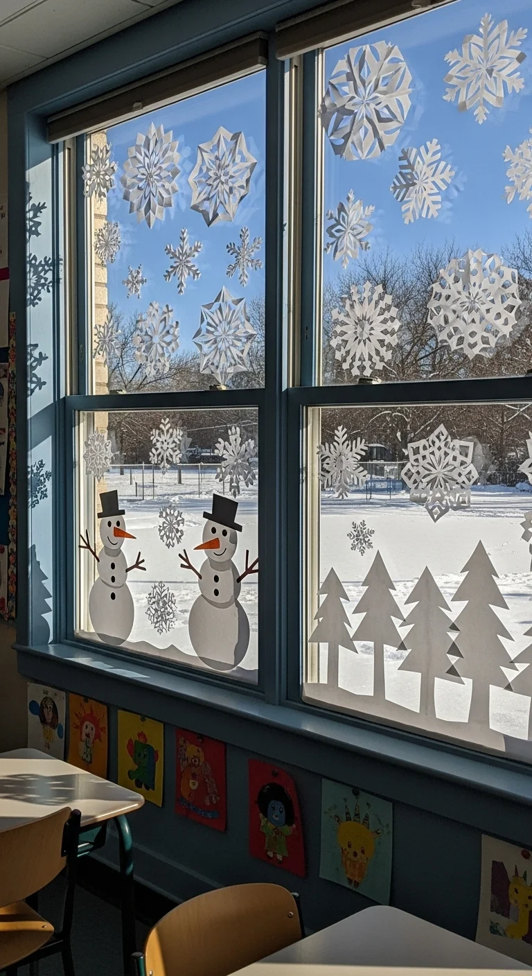 Use white paper and scissors to create a winter landscape on your windows. Cut out snowflakes, trees, and snowmen. Stick them to the glass using removable adhesive. If your school allows, add washable white paint for a snowy effect.