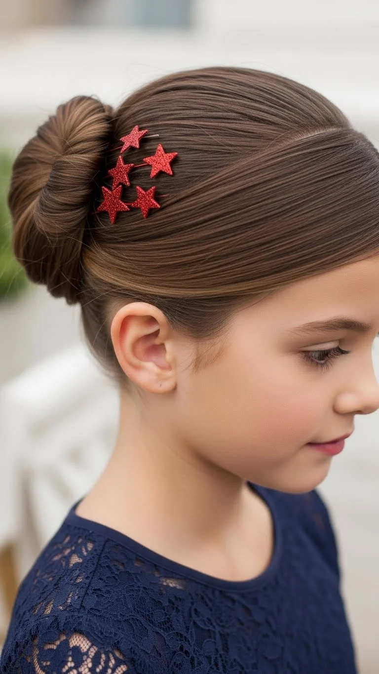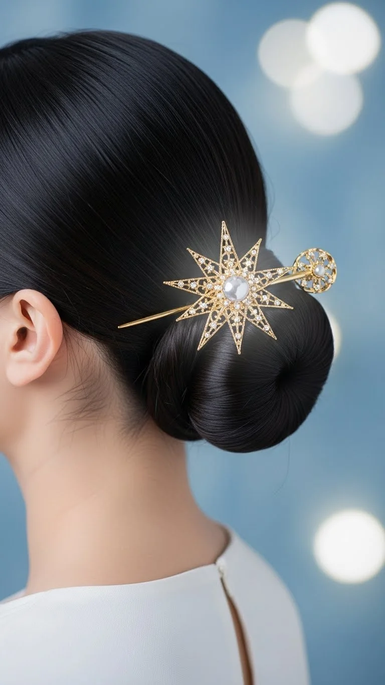 For a more traditional feel, a star accessory is perfect. Create a low, smooth bun at the back of the head. Place a gold star clip or pin directly into the center or just above it. You can find star ornaments or jewelry pieces that can be easily converted into hair pins. This look is very sophisticated for a church service or a school play. It works best on medium to long hair. Use a fine-tooth comb to ensure the hair is slick and tidy.