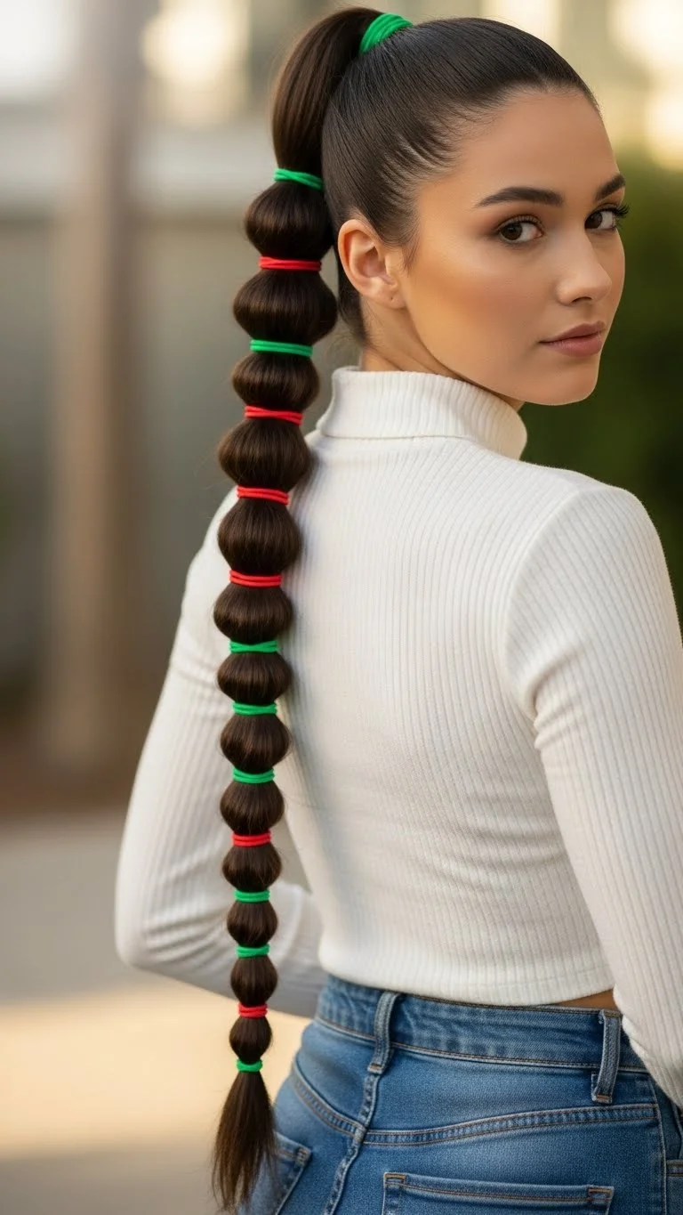 This is a fun way to use those packs of colored elastics. Pull the hair into a high ponytail. Add alternating red and green bands every inch or two down the length. It creates a colorful, striped effect that looks like a holiday garland. This is a very secure style for kids who will be running around. It’s also very cheap since a pack of colored elastics usually costs only a dollar. It’s bright, cheerful, and requires zero braiding skills.