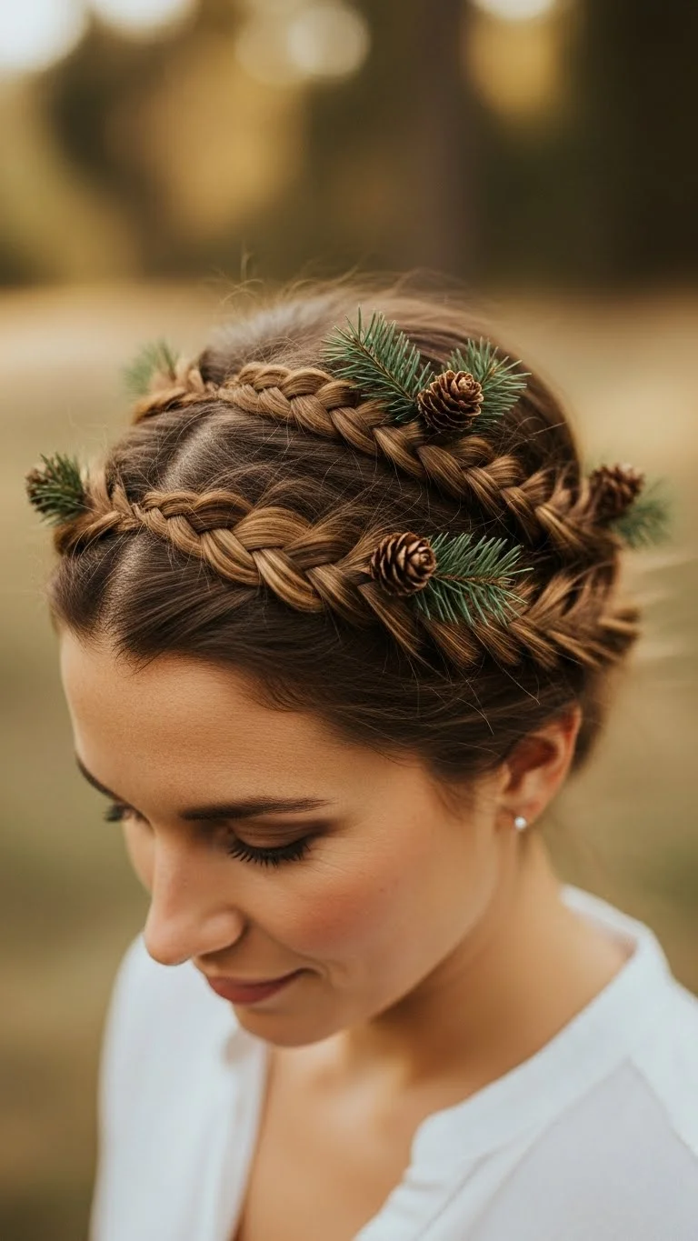 For a rustic, woodland look, try a braided crown. Make two braids on either side of the head and pin them across the top. Tuck in miniature pinecones or small sprigs of faux evergreen. You can find these in the floral section of a craft store. It looks very natural and earthy. This style is great for outdoor holiday photos. Ensure the decorations are pinned tightly so they don’t fall out. It’s a unique alternative to the standard red and green theme.