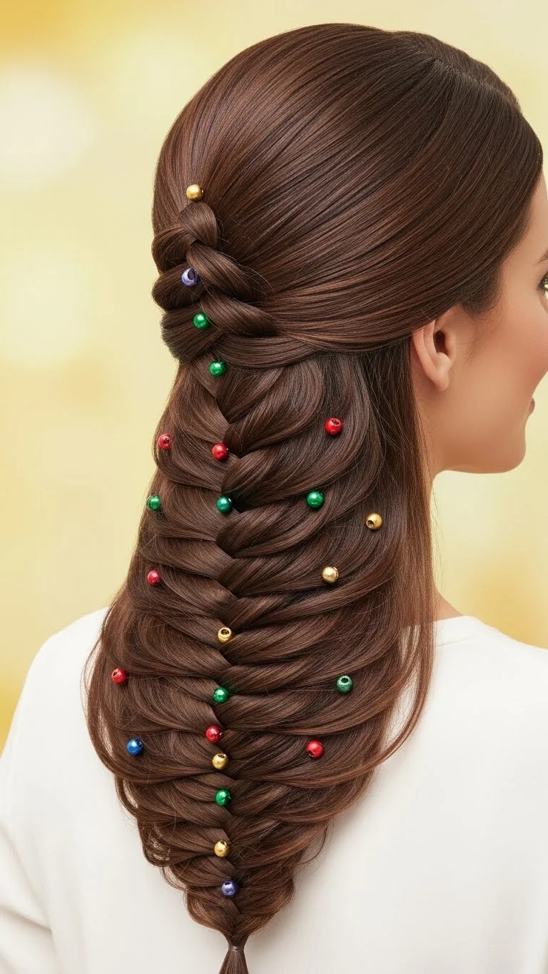 This is a creative way to use a French braid. Start a very narrow braid at the top of the head. As you go down, pull in more hair to make the braid wider at the base, forming a triangle shape. Add small green ribbons or colorful beads throughout the braid to represent tree decorations. You can even put a small gold star at the very top. It’s a literal take on holiday hair that kids find hilarious and fun. It’s a great conversation starter at family events.