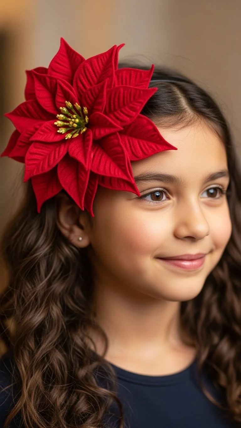 If you are short on time, a headband is your best friend. Choose one with a large silk poinsettia. You can buy a plain headband and hot-glue a flower from a cheap floral bush onto it. This takes seconds to put on but looks like a lot of effort. It works beautifully with loose curls or even a simple bob. It’s a classic holiday accessory that never goes out of style. Plus, it’s easy for the child to take off if they get tired of it.