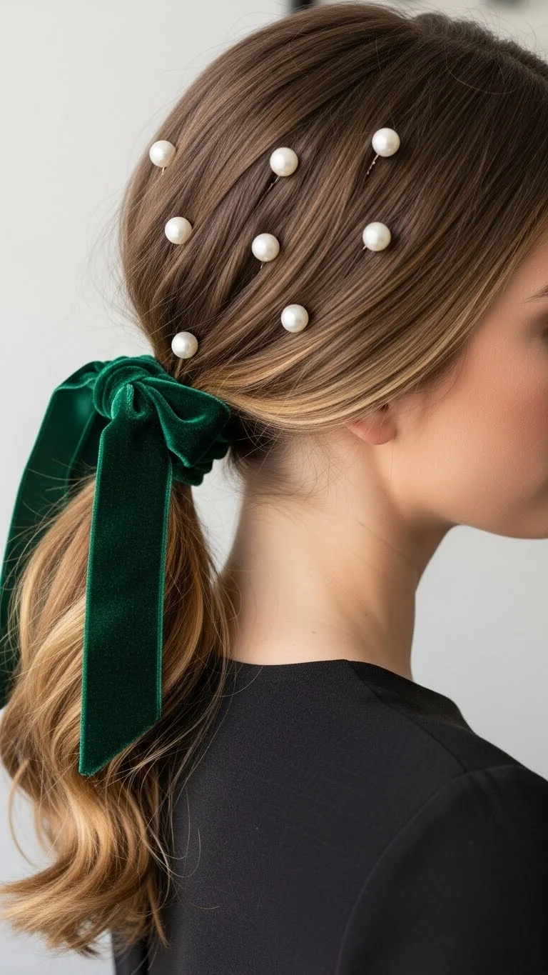 For a “White Christmas” vibe, pearls are a perfect choice. Pull the hair into a soft, low ponytail or a half-up style. Scatter pearl-topped pins throughout the hair. You can make these by gluing craft pearls onto the ends of bobby pins. It looks very high-end and snowy. This is a great look for older girls who might want something a bit more “grown-up” but still festive. It’s affordable, elegant, and very easy to achieve in just a few minutes of styling.