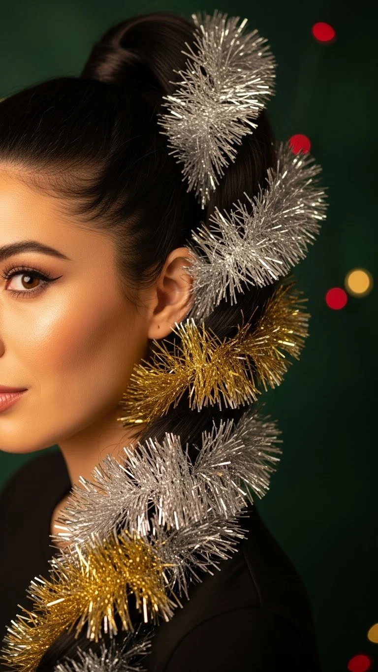 If your girl loves sparkle, this is the easiest choice. Grab a few strands of leftover tinsel from your tree decorations. Tie them onto a hair elastic before putting the hair up. Once the ponytail is secure, the tinsel hangs down with the hair. It catches the light beautifully when she moves. You can also braid the tinsel directly into the hair for extra grip. This costs nothing if you use scraps from your decor. It’s a great way to recycle extra holiday trimmings.
