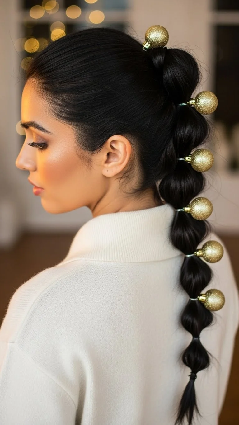 Bubble braids look fancy but only require elastics. Space out several elastics down a ponytail. Pull the hair between the bands to create a “bubble” shape. To make it festive, clip miniature plastic ornaments onto the elastics. You can find these small ornaments in the “mini tree” section of most shops. They are very lightweight and won’t pull on the scalp. Use clear elastics to make the bubbles stand out. It’s a modern look that feels very festive and high-end.