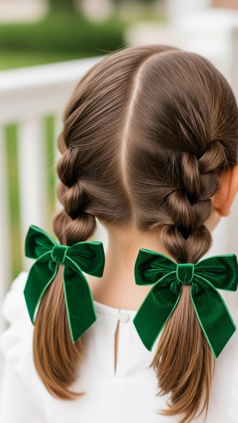Twists are easier than braids for many parents. Take three small sections of hair at the front. Twist each one back away from the face. Secure them into low pigtails at the nape of the neck. This keeps the hair very secure for active kids. Add some green velvet bows for a soft, holiday texture. Velvet is a classic winter fabric that looks more expensive than it is. You can buy velvet ribbon by the yard for a few dollars. It’s a sturdy, practical style.