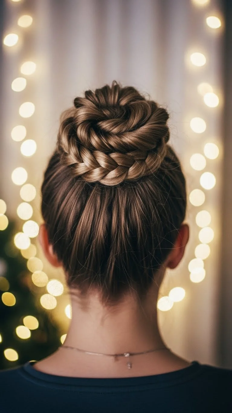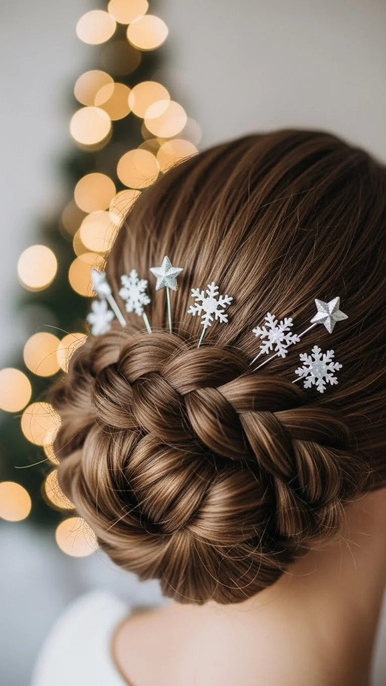 A braided top knot keeps hair out of the way while still looking stylish. Gather hair high on the head, braid it, then wrap it into a bun. Add a soft scrunchie or sparkly clip for a festive hint. It’s great for busy days when you want something quick. If your hair is shorter, use a donut bun base for support. It looks great in photos and stays secure all evening.