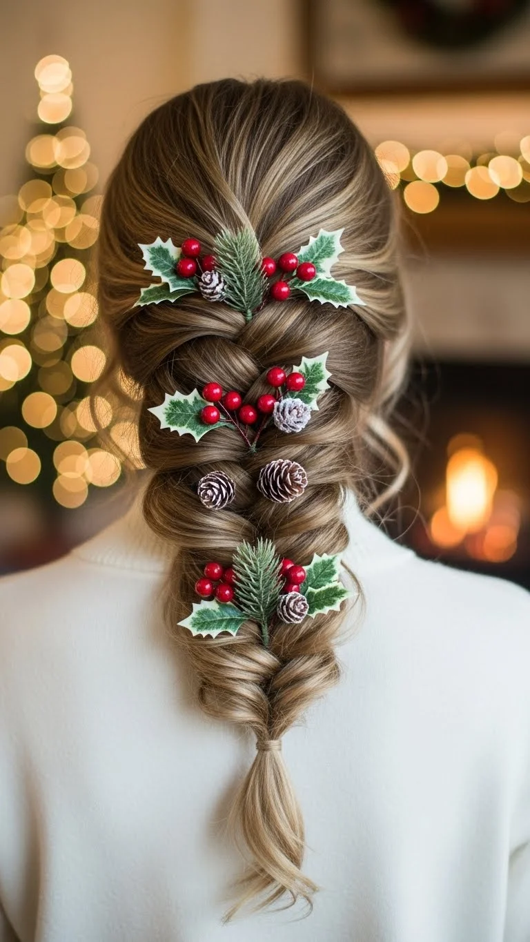 A pull-through braid looks full without much effort. Use elastics to create small ponytail sections and pull them through each other. It’s easier than it looks. Add a ribbon woven down the center for Christmas charm. This style works well for thin hair because it creates shape. Keep it loose for softness. It stays secure through long events. If you’re on a budget, elastics and one ribbon are all you need.