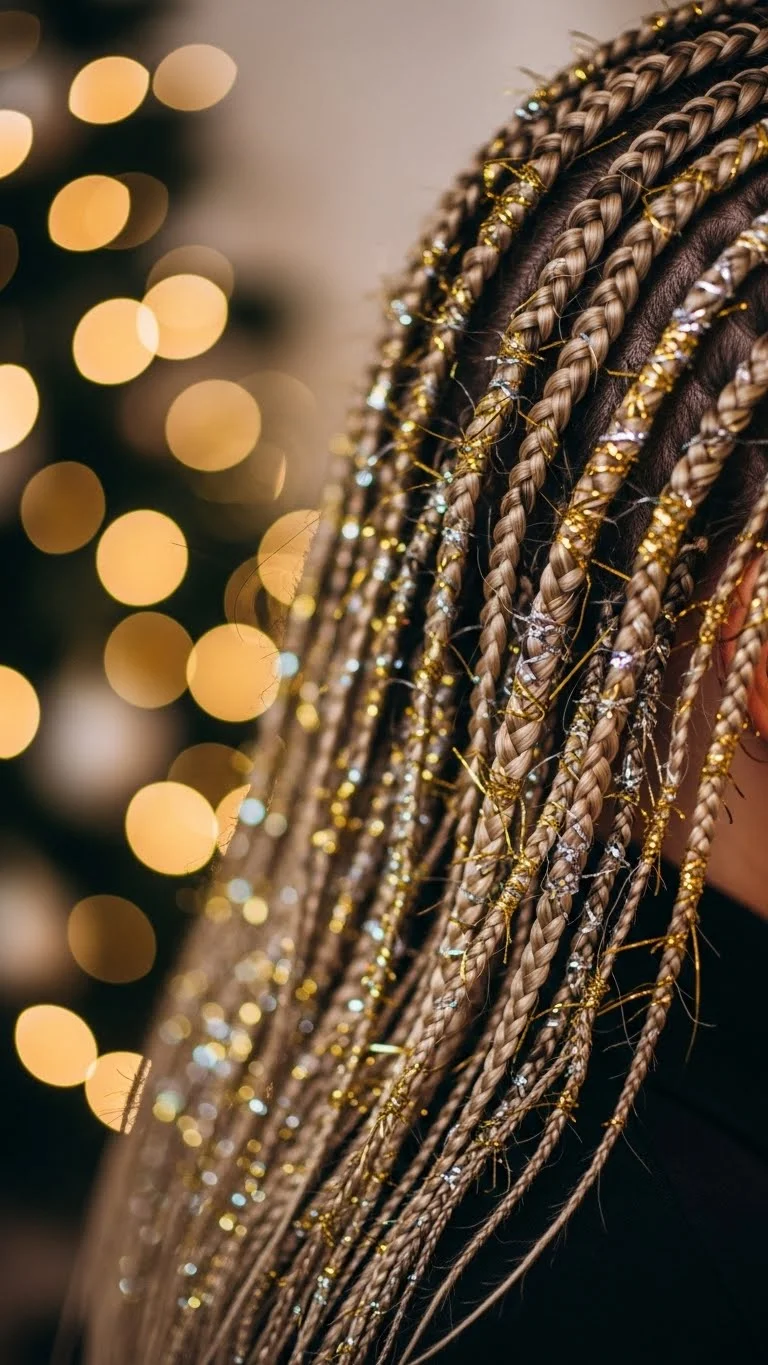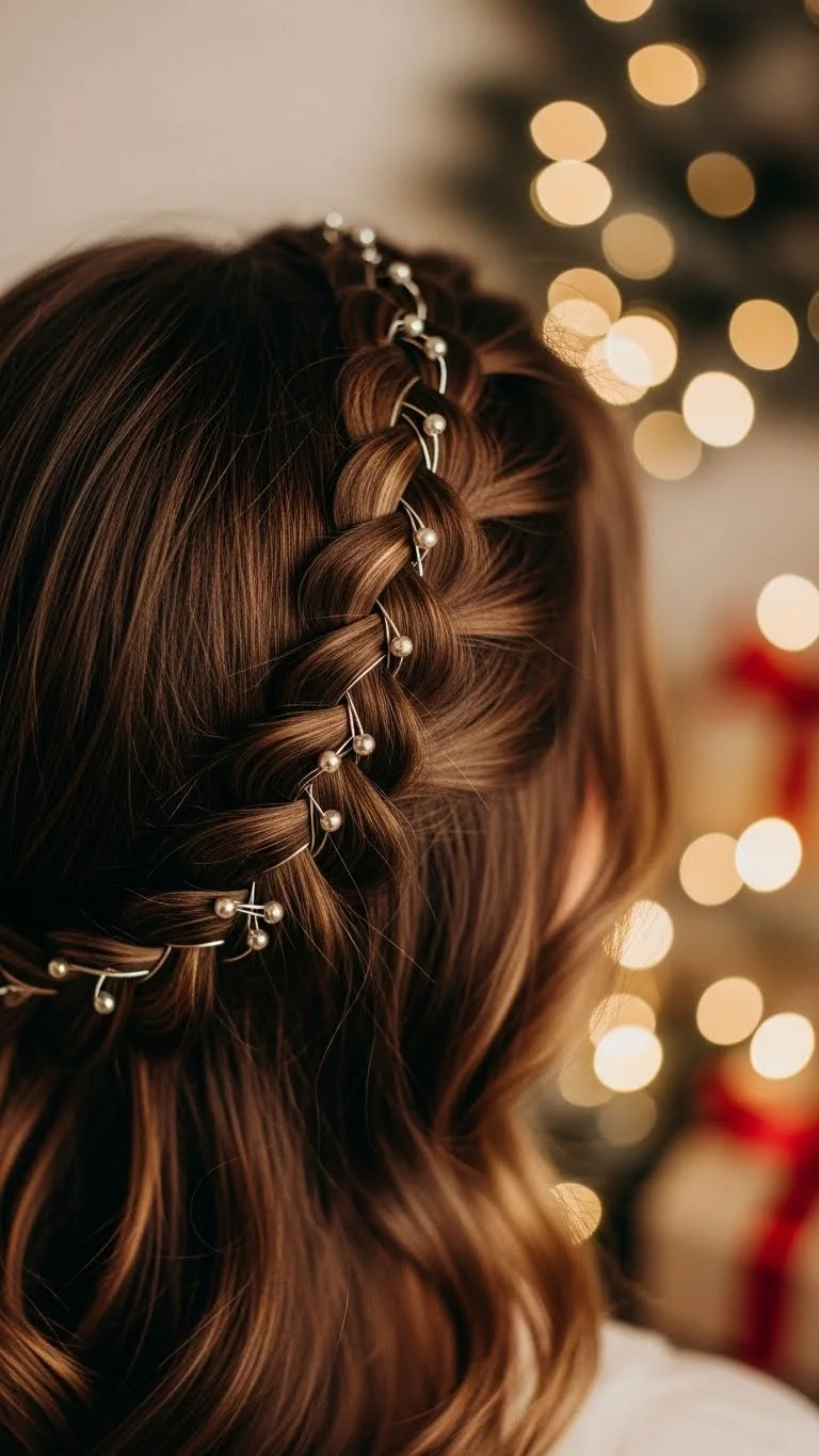 Mini braids with tinsel add shimmer without much effort. Clip in a few strands of tinsel, then braid small sections around your head. It sparkles beautifully under Christmas lights. This is a budget-friendly pick because tinsel packs are cheap. Keep your hair loose and natural for a soft texture. It works well on straight or curly hair. Perfect for parties or casual gatherings.