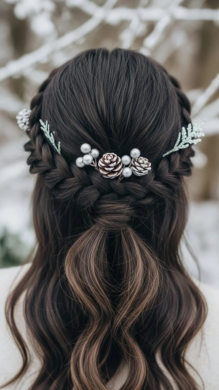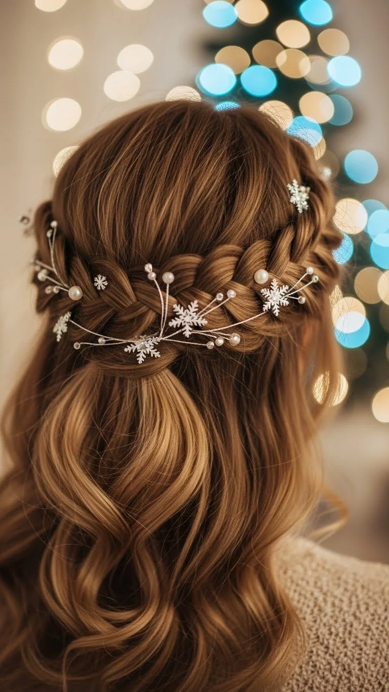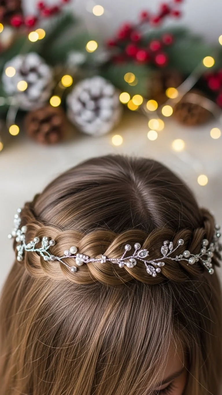 A braided headband frames the face beautifully. Take a small section from behind your ear, braid it, and pull it over the top like a band. Pin it on the other side. Add tiny snowflake pins along the band for a seasonal touch. This style keeps hair away from the face and works on all textures. If your hair is short, use two braids to increase length. It’s simple, neat, and perfect for holiday outings.