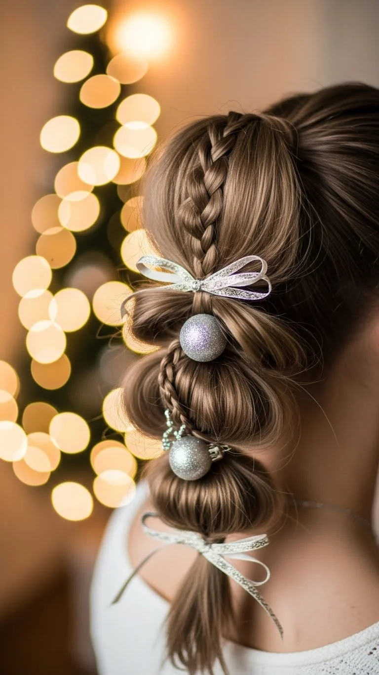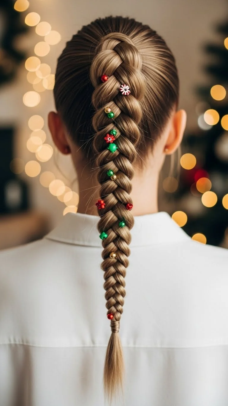 Adding beads to a braided ponytail gives it a fun holiday feel. Choose small red, gold, or white beads. Thread them near the ends of the braid. It’s affordable and reusable. Keep the ponytail mid-height for comfort. This style works for long or medium hair. It’s easy to do and holds well for all-day events.