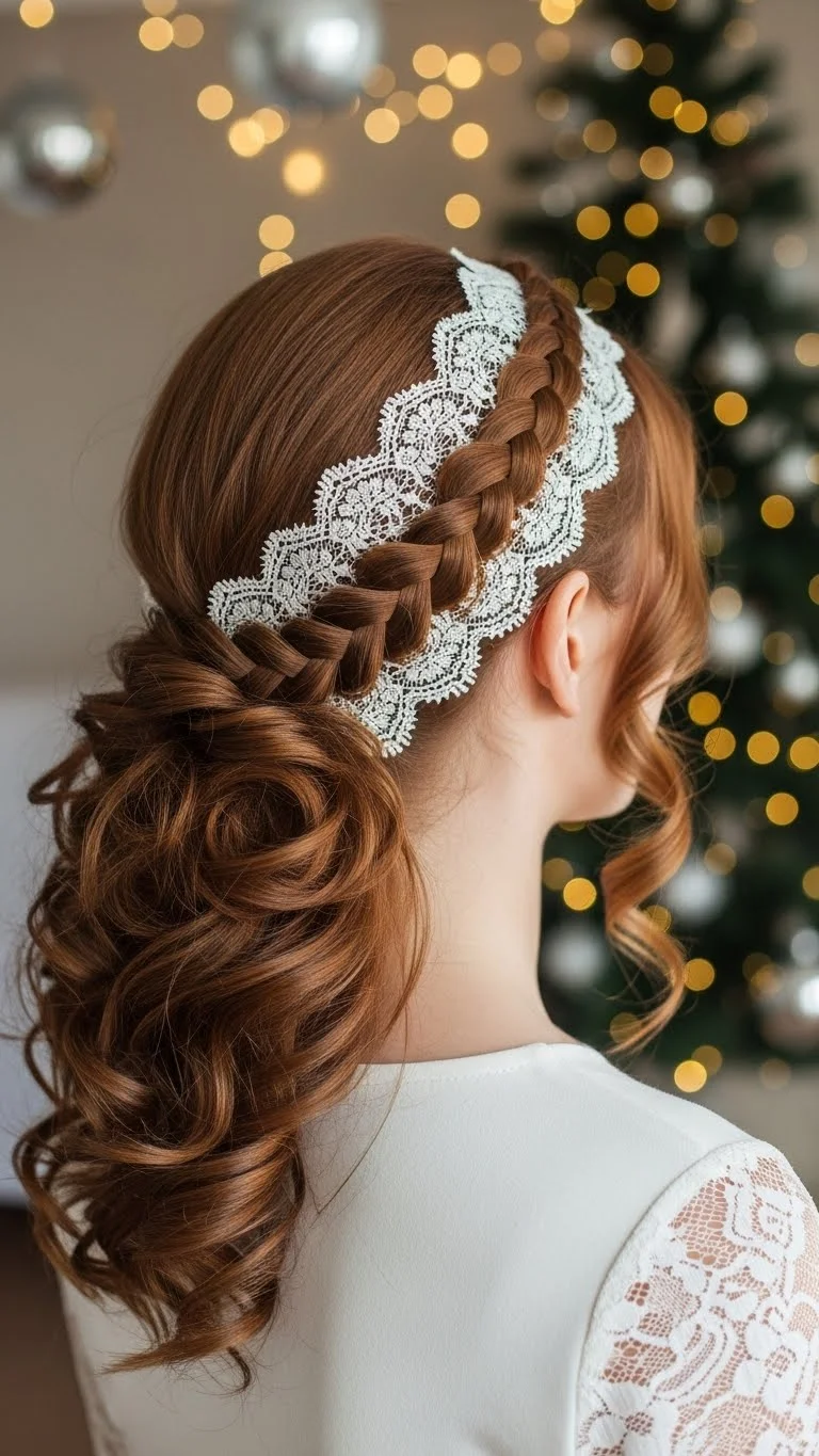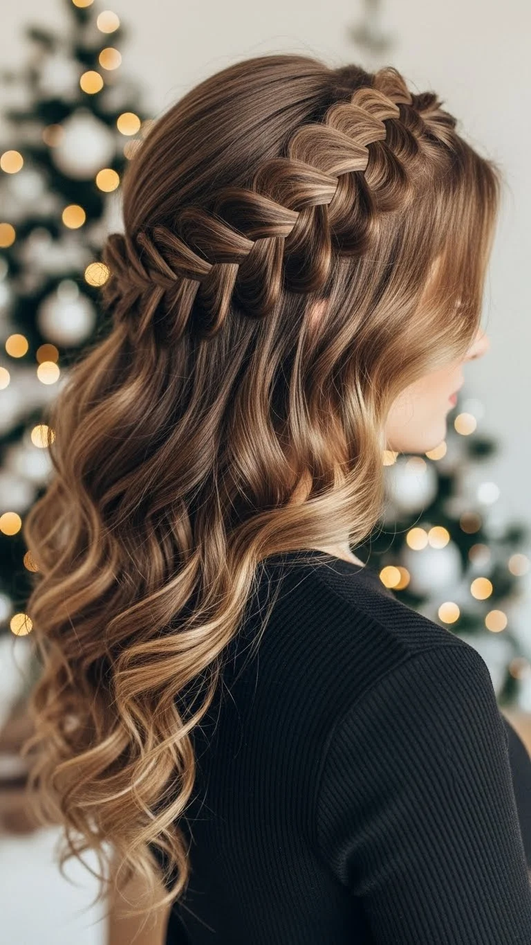 A lace braid is similar to a French braid but picks up hair from only one side. It creates a soft, sweeping line. Pair it with loose curls to add movement. Add small holiday clips near the end of the braid. You don’t need much product—just a bit of hold spray. This works well if you want hair mostly down but still styled. It’s elegant and easy for Christmas outings.
