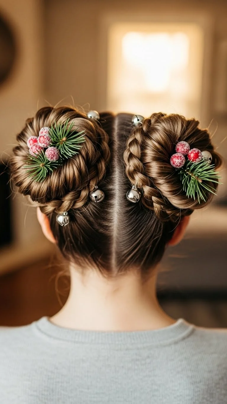 Braided space buns feel fun and playful. Part your hair down the middle, create two braids, and twist each into a bun. Add holiday clips for flair. This style stays secure for long events and is great for dancing or parties. If your hair is short, make mini buns. It’s affordable, quick, and perfect for anyone who likes a cheerful look.