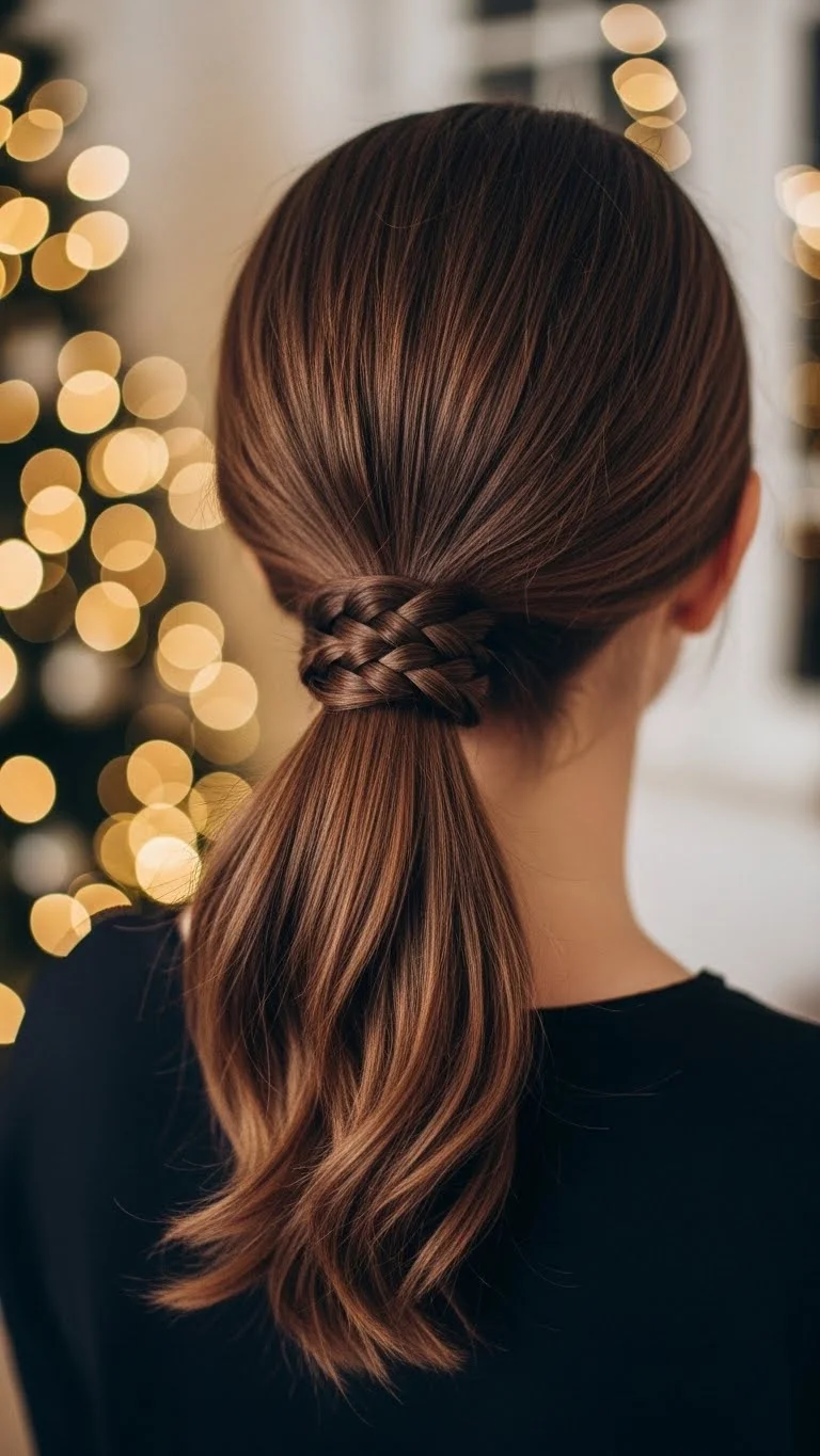 This style looks polished but takes only minutes. Make a low ponytail, then braid a small section from underneath and wrap it around the base. Pin it discreetly. Add a soft bow or holiday clip. This is perfect when you want something simple and clean. It works well for work parties and family gatherings. No expensive products needed.