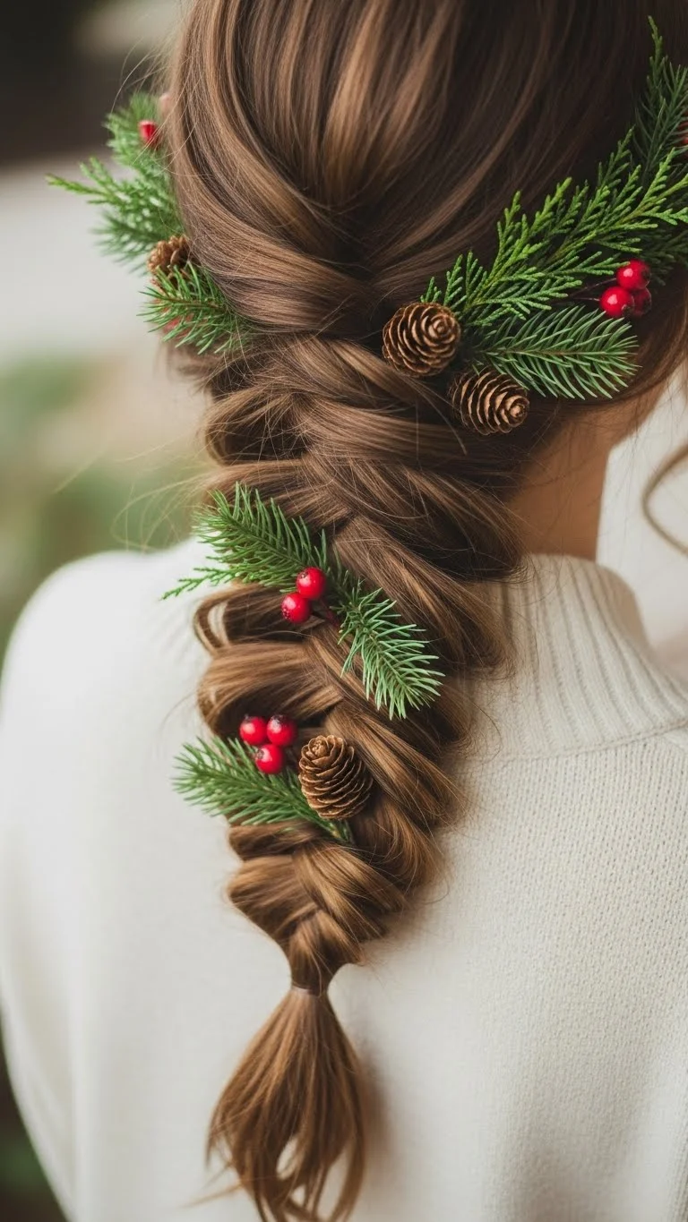 Adding faux florals gives a gentle winter vibe. Pick small red berries or tiny white flowers. They’re cheap and easy to pin in. Make a loose braid on one side and tuck the florals along the edges. This creates a soft, romantic shape. It’s perfect for holiday portraits. Keep the braid messy for charm. If your hair is fine, tease the crown slightly for lift. This idea works on medium or long hair.