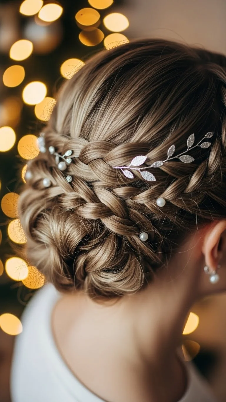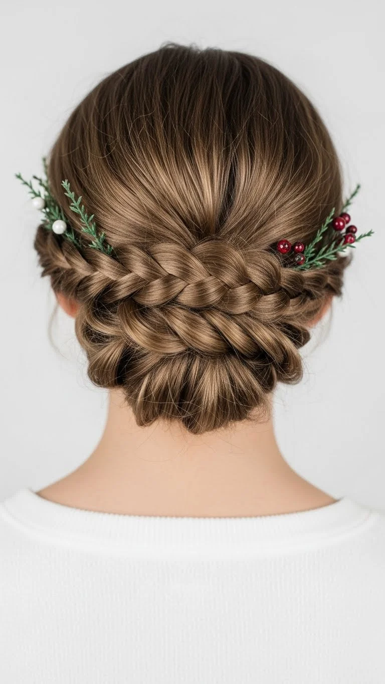 A braided updo works well for formal Christmas gatherings. Make two braids and wrap them around the back of your head. Pull lightly for softness. Add pearl pins or holiday clips. It looks delicate but stays secure. You only need bobby pins and a few minutes of shaping. Perfect for parties, photos, and special dinners.