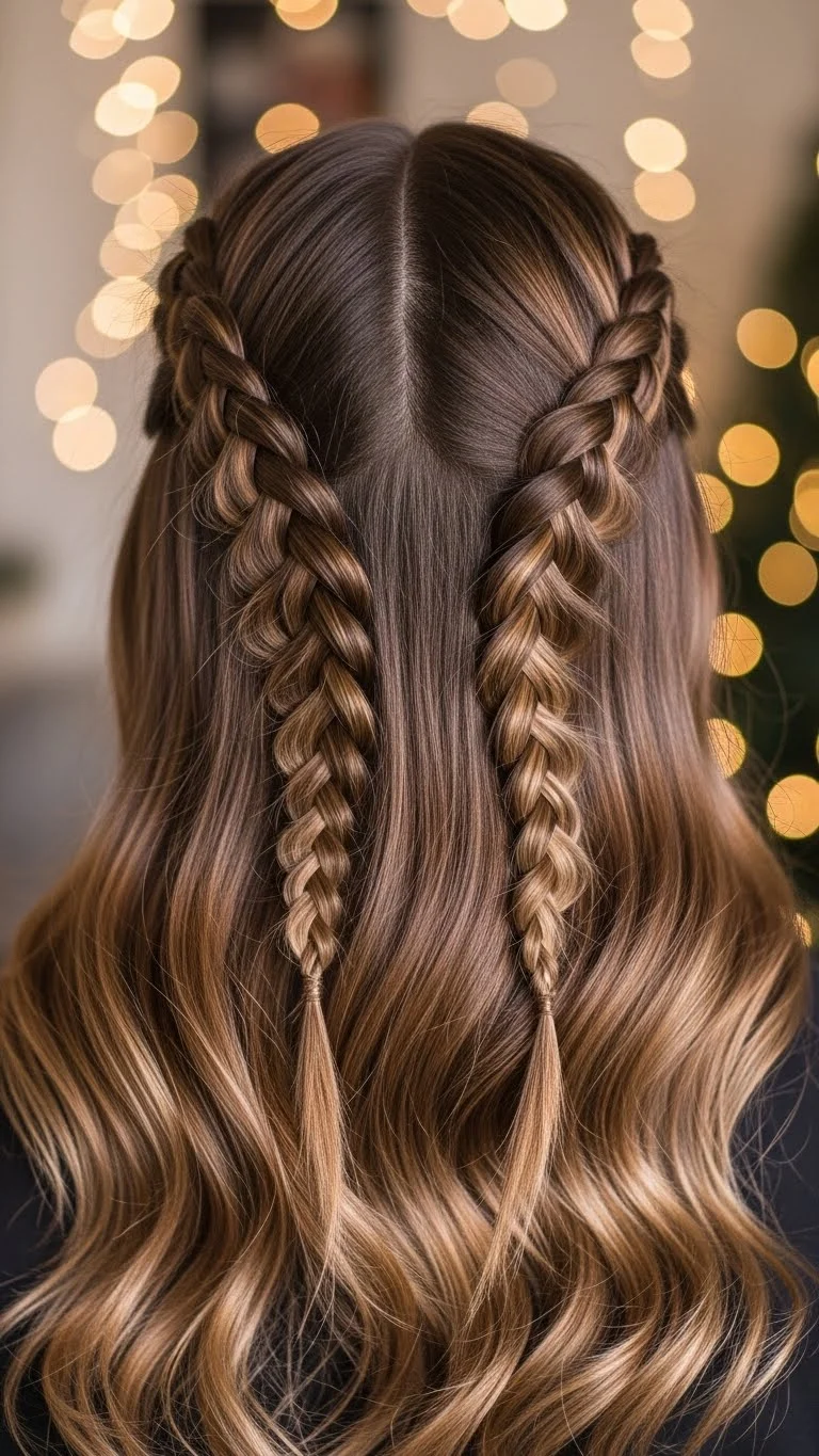 Two small rope braids add a clean touch to loose waves. Twist small sections from above the ear and secure them behind the head. Add subtle holiday pins. This style is effortless and works for daily wear or parties. You only need elastics and a few minutes.