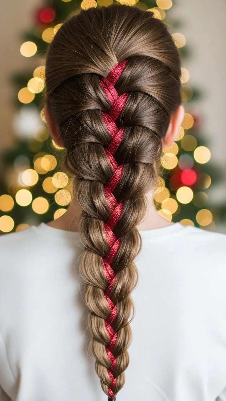 Adding ribbon to a French braid brings instant holiday charm. Choose red, green, gold, or white for a festive look. Secure the ribbon at the top with a tiny elastic, then braid normally. It looks intricate but takes the same time as a regular braid. If the ribbon slips, weave it closer to the outer strands. This is a great budget idea because ribbon is cheap and reusable. Keep the braid tight for a neat finish or loosen it for softness. You can wrap the tail with more ribbon for a polished touch. This style holds well all day, which makes it perfect for parties and school events.
