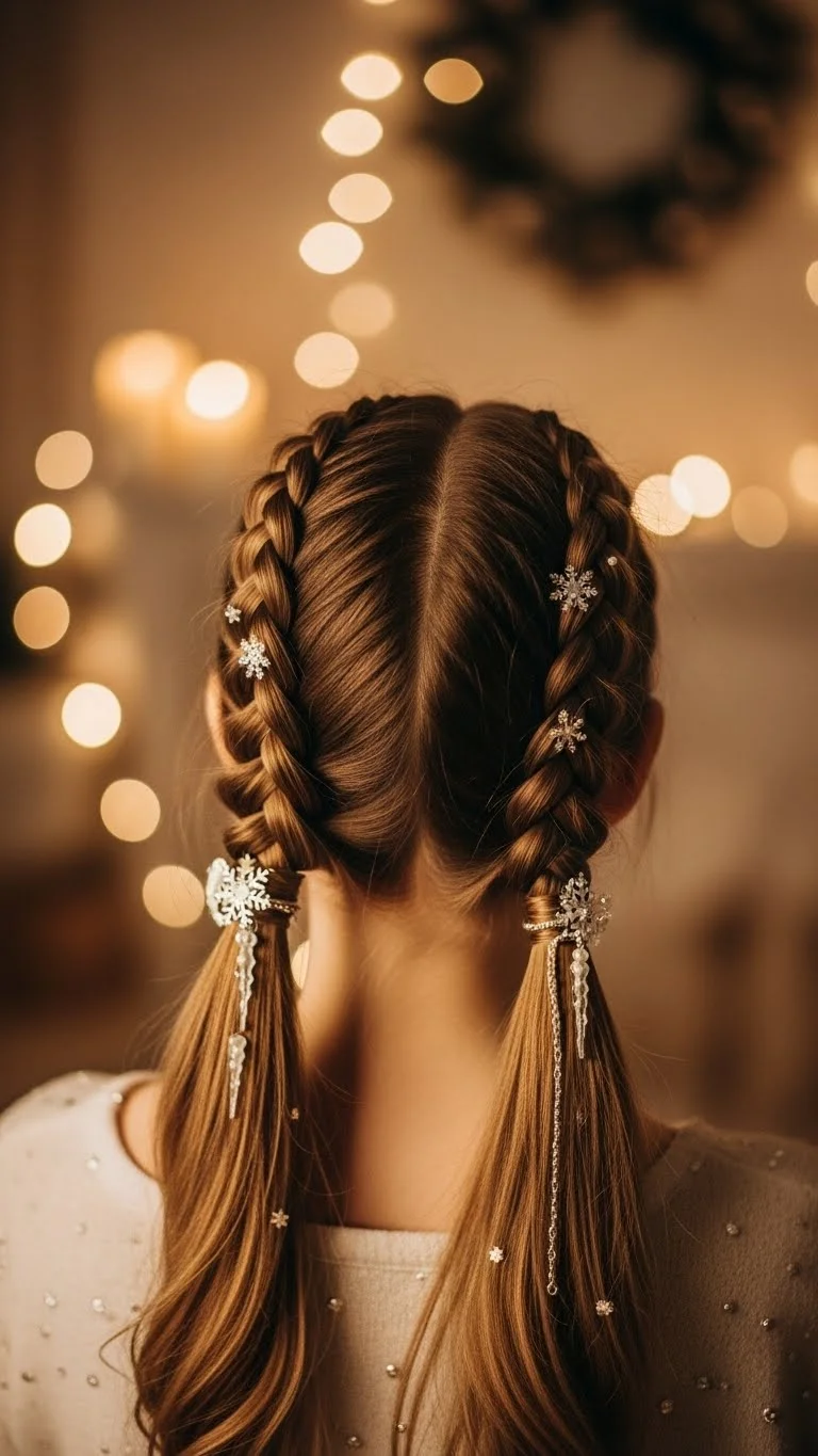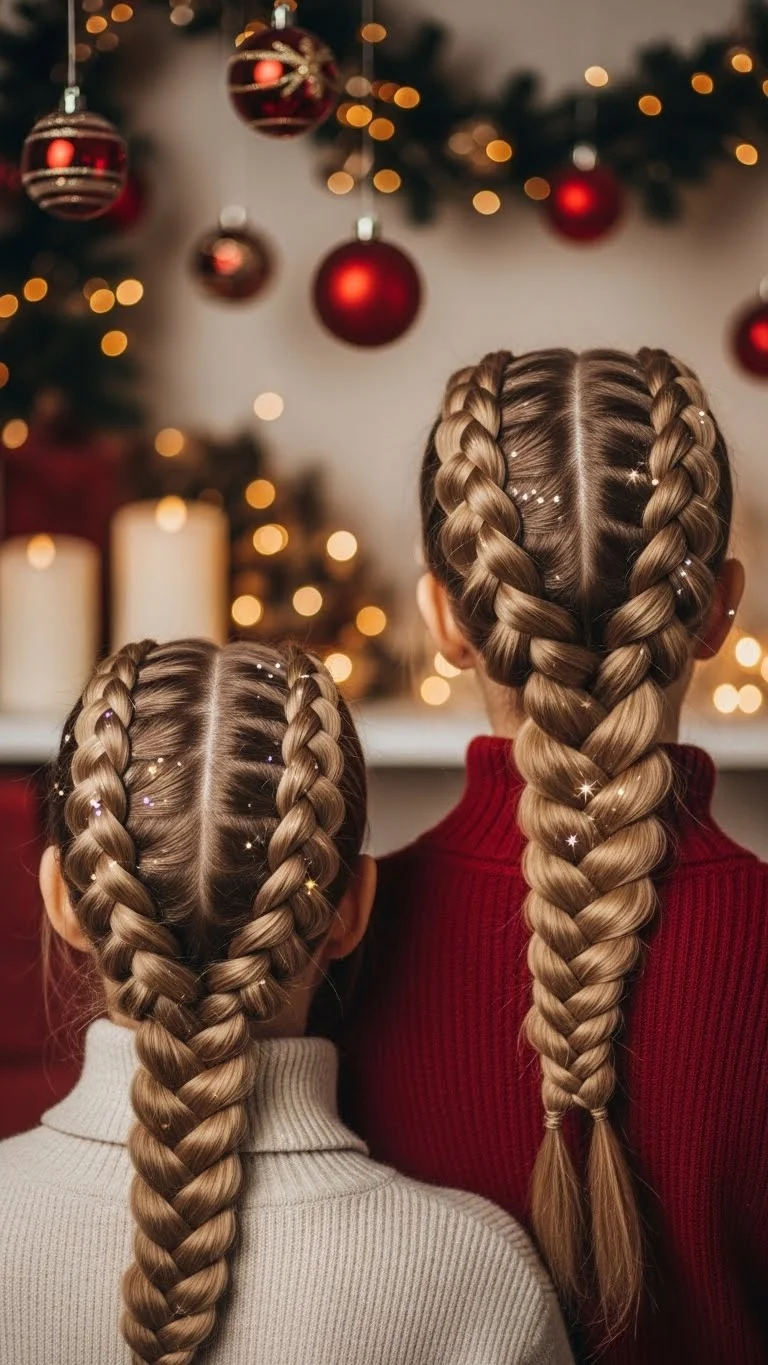 Two braids bring a fun, youthful vibe to Christmas gatherings. Part the hair down the middle and create two simple braids. For a holiday twist, add ribbons at the ends or weave in thin strands of sparkle tinsel. Keep the braids loose for softness or tighter for a clean finish. This style works on any length down to shoulder level. It’s super affordable because you only need elastics. Kids love this style, but adults can wear it too with softer, more relaxed braids.