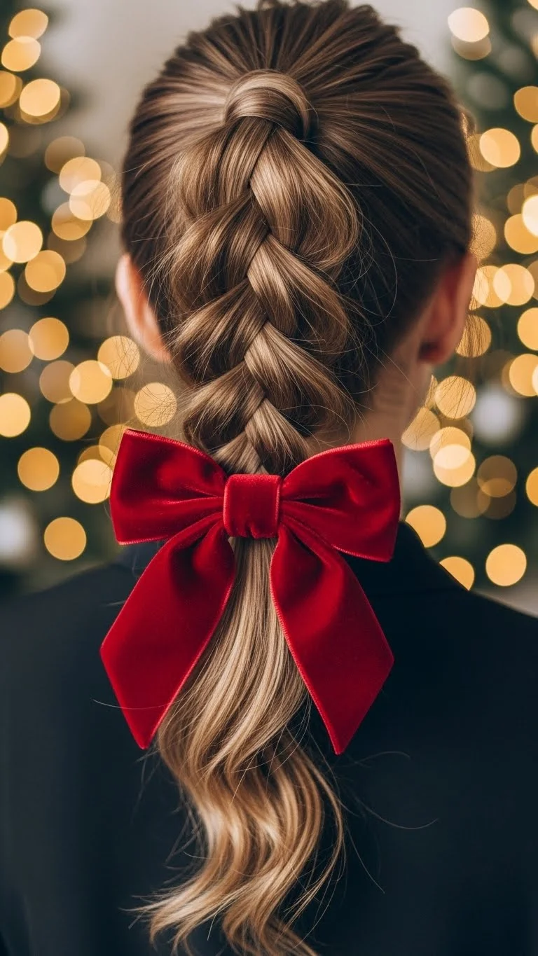1. Braided Ponytail with Velvet Bow