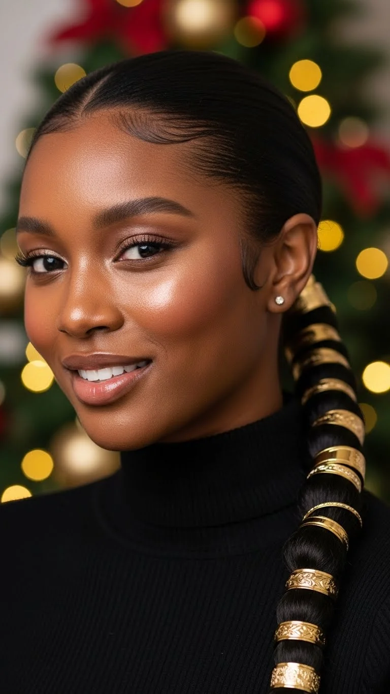 A sleek low ponytail creates a clean look that works for every holiday setting. Start with a good brushing session. Add a small amount of lightweight gel for shine. Keep the ponytail low near the nape for a polished finish. Gold cuffs add holiday warmth without costing much. You can find a full pack at local markets or online for a few dollars. Wrap a satin scarf for ten minutes to set the style. This keeps the hair smooth. If you want extra comfort, switch the elastic to a silk scrunchie. It pulls less and protects your strands. Add a mist of holding spray only on the top layer. You don’t need a lot. A few spritzes keep everything in place. This style works well for parties, dinner nights, or gift-giving photos. The best part is how quick it is to do. Even beginners can finish it in under ten minutes. If your ponytail is shorter, add clip-ins that match your shade. They blend well and stay hidden when placed under the base. Keep the accessories simple to let the gold shine.