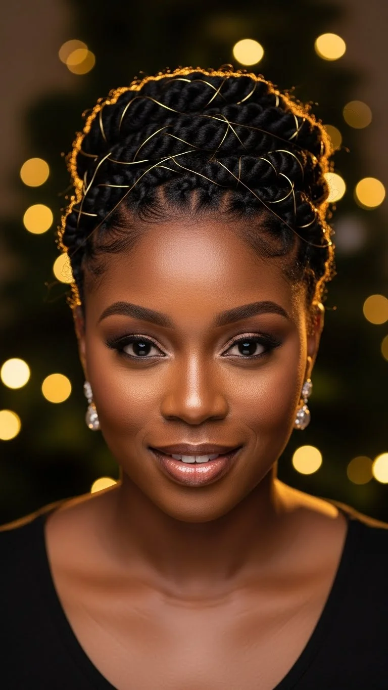 A twisted updo adds gentle height and elegance. Use medium sections to create flat twists going upward. Gather the ends into a small bun or tuck them under. Wrap thin gold wire around a few twists for holiday shine. The wire is cheap and easy to shape by hand. Add light gel only near the front. Keep the rest soft. If your hair is shorter, create smaller twists. They still look stylish when gathered together. Add a little oil for shine. Avoid heavy products so the twists don’t slip. This updo works well with turtlenecks, dresses, or simple sweaters. It’s great for any event where you want a cozy, polished look.