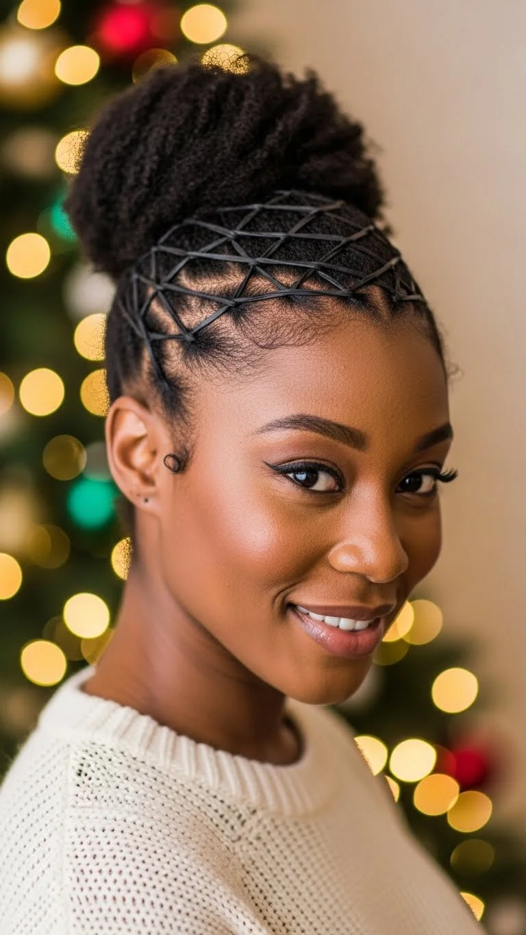 This style adds cute detail without needing extra time. Create small square sections in the front. Use coated rubber bands to avoid breakage. Cross each section over the next. Secure gently so it stays comfy. Leave the rest of your hair in a puff, twist-out, or braid-out. Add gold or red rubber bands for a holiday touch. This style is affordable and easy, even for beginners. Refresh it daily with a little water spray. Keep the bands loose enough to protect your edges. This look pairs nicely with hoops or studs. Great for kids and adults during the holiday season.